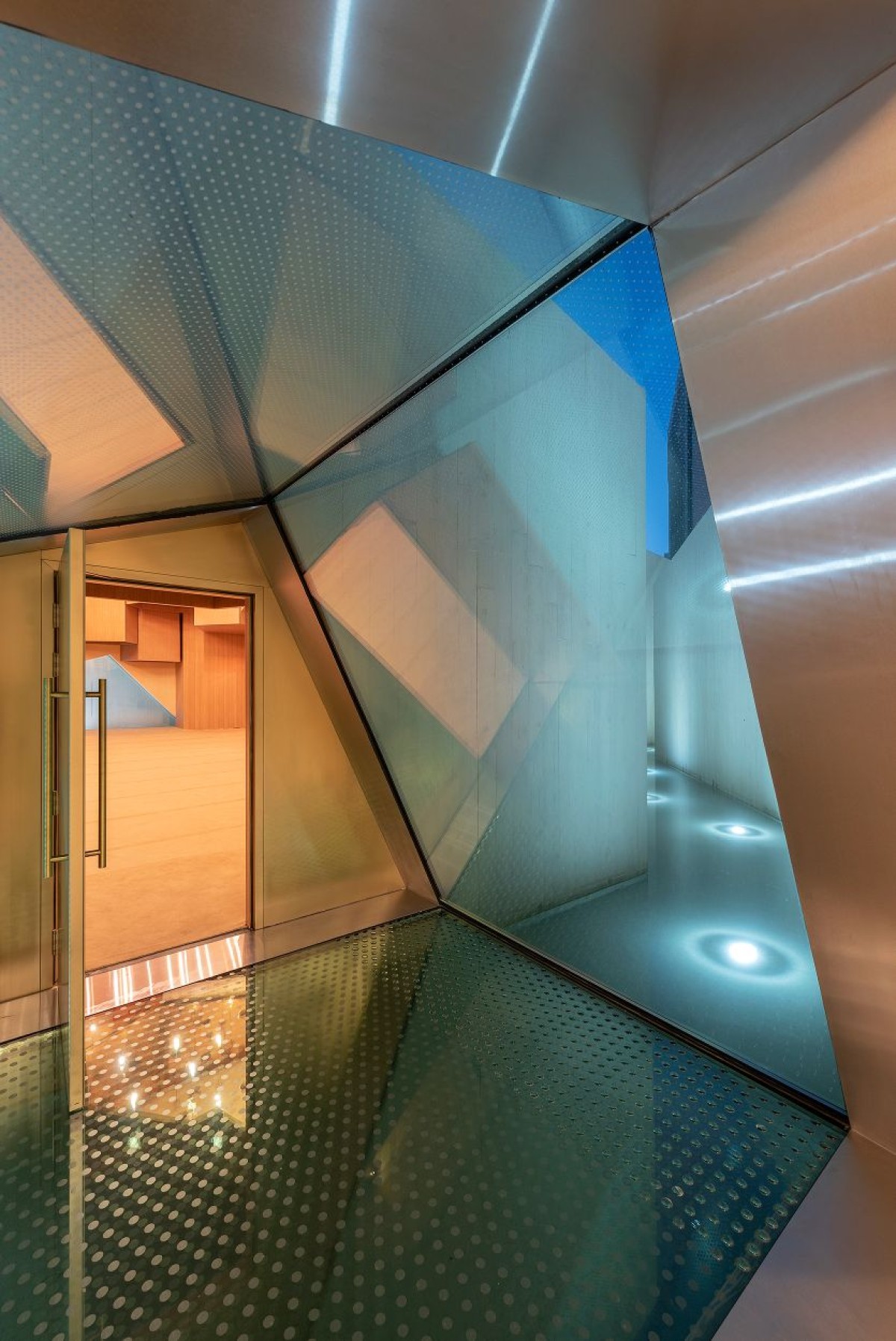 As an important element of the cultural park, the prayer hall is located at the north-eastern corner of the site as a series of small, interconnected buildings that form a cave-like structure pushed halfway into a large water feature. The Musallah stands in water to create a subtle privacy barrier without using walls, which provides calm and secluded spaces for prayer without visual disturbances. At the same time the water is used as a symbol of spiritual purification flowing around and in between the interior functions. The individual spaces are connected by glass tubes bridging over water, which symbolically purifies the mind when moving through the light-filled passages from one area to the next.