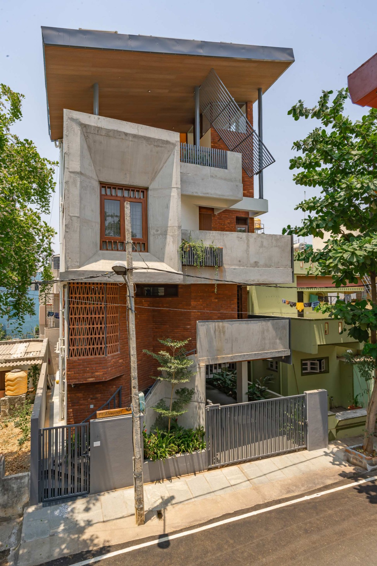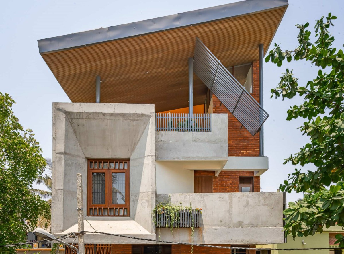 Despite the limited footprint, spatial generosity is achieved through clever planning. The entry is raised, accessed via angled green-edged steps, which sets the tone for the house—a thoughtful journey, not just a threshold. Small planters and vertical greens are tucked throughout the facade and terraces, softening the raw materiality and connecting the indoors to nature wherever possible.
