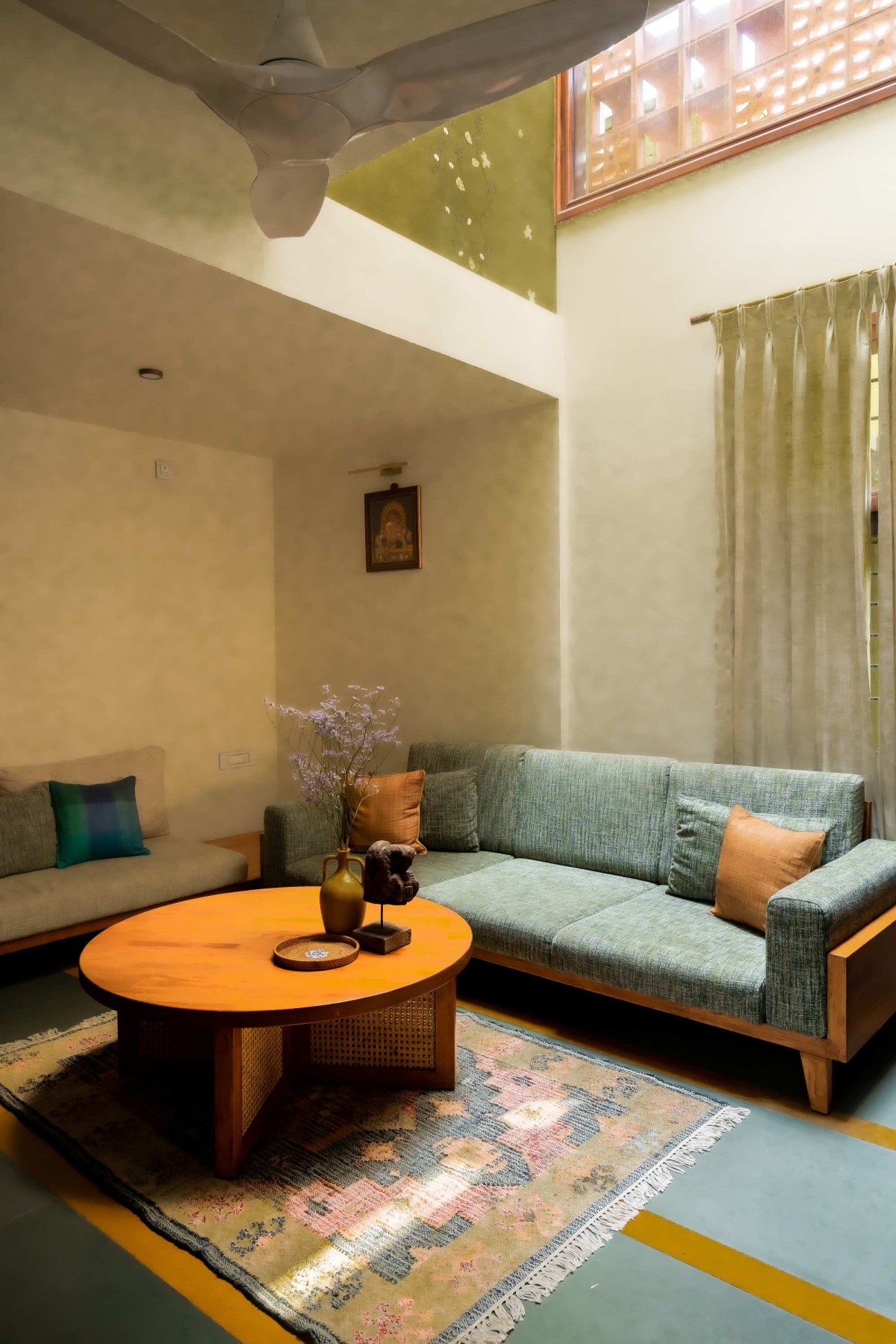 Natural light and ventilation were treated as primary design drivers. Large windows, open-to-sky cutouts, and a central skylight allow sunlight to filter through the house through the day, while ensuring passive cooling and reducing reliance on artificial light. Cross ventilation is carefully orchestrated with openings positioned along diagonal axes, ensuring airflow across rooms even during peak summer.