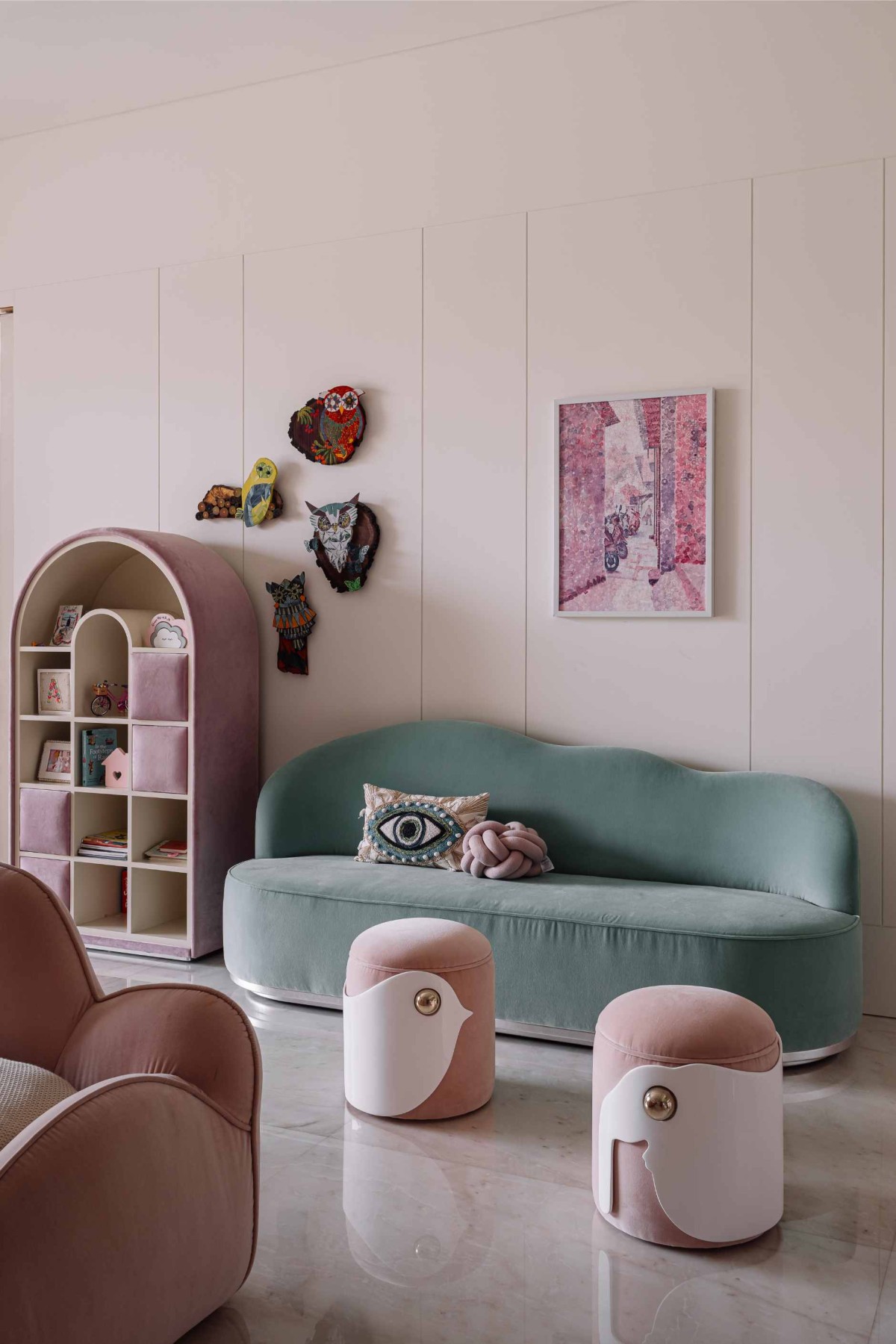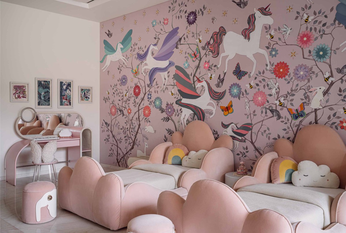 The master bedroom connects to the children’s room with a private courtyard - a thoughtful intervention by the designers to allow for adaptability in the future as the family’s needs evolve. The daughter’s bedroom is itself a space of joy and energy, with soft fabric elements, vibrant colors and plenty of room to move around in. Its design mirrors the vibrancy of childhood, offering both a personal haven and a space to grow into.