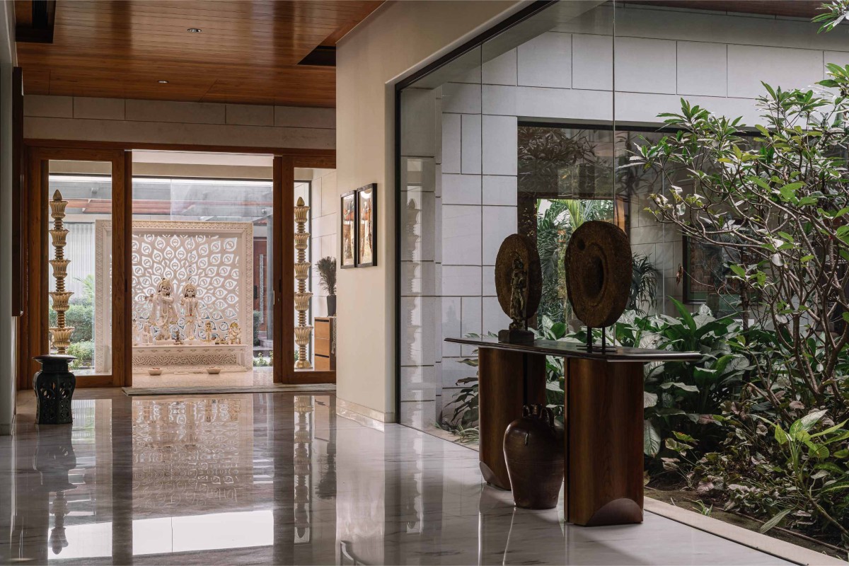 As they retrace their steps to the other side of the foyer, they arrive at the pooja space, where intricately handcrafted marble elements create a sense of quiet grandeur. Soft natural light filters through glass windows, connecting the space to nature and enhancing its serene, almost ethereal quality.