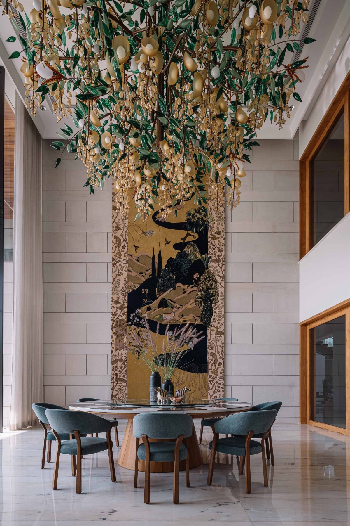 Beyond the bedrooms, the home once again opens into a grand double height area that houses the dining space. Here, an ornate fabric artwork stretches across the full height of the space. When paired with the magnificent glass chandelier overhead, it adds to the depth and character of the interiors. Beneath it, a classic dining table anchors the room, surrounded by finely crafted chairs that balance elegance with comfort. The interplay of textures - rich upholstery, polished wood, and delicate glass - creates a layered and inviting atmosphere.