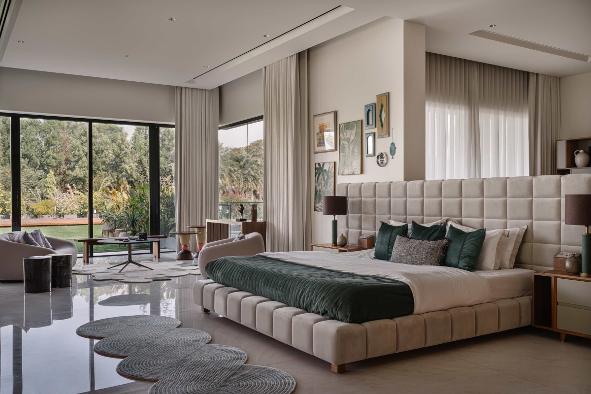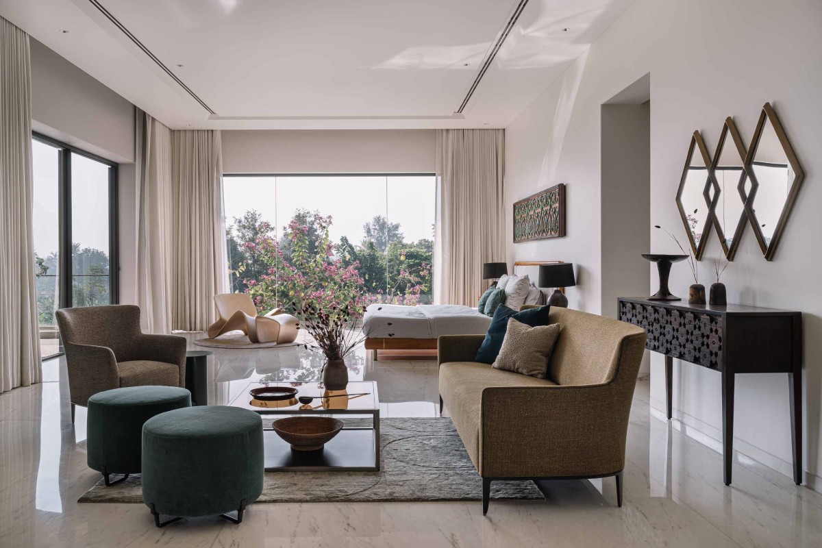 Walking along the passage on one side of the foyer - a sculptural staircase comes into view. Staircases are signature elements of HPA’s design philosophy, and this is no exception. Crafted from rich sheesham wood, the staircase rises in a double height space, enveloped in glazing that frames sweeping views of the surrounding landscape. Past this statement feature, the private spaces begin - the parents’ room, the master room and the children’s room. Each is designed as a self-contained retreat, complete with a personal courtyard, a cozy lounge and a restful sleeping area. Materials and textures flow naturally from one room to another - hand-knotted carpets anchor the spaces, soft velvets and hand stitched fabrics lend a plush elegance to the furniture, and rich wood accents add depth and warmth. Every layer comes together in a masterful composition to enhance the home’s opulence.