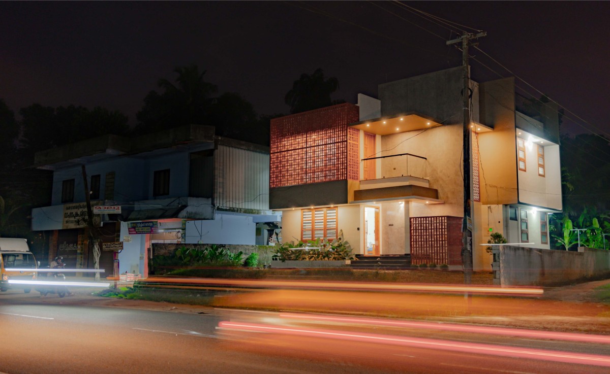 Night exterior view of Ancy & Ansu Residence by Stria Architects