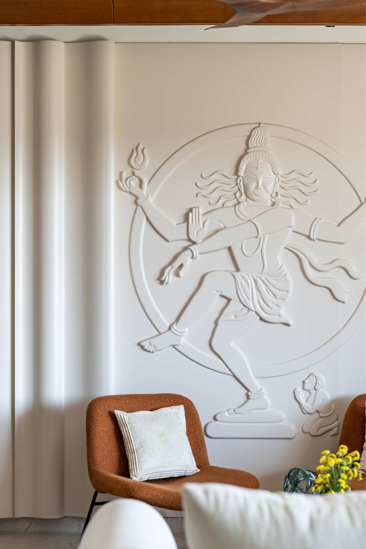 The interiors follow a vibrant yet earthy colour palette, combining soft peaches, warm neutrals, and grounded tones to maintain harmony across spaces. Clean lines, subtle textures, and balanced compositions create an environment that feels sophisticated yet emotionally comforting.