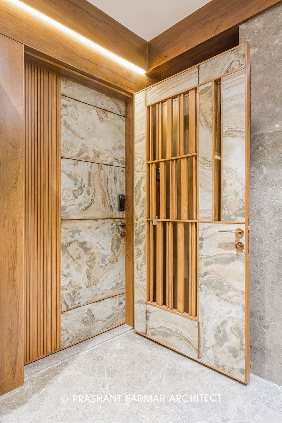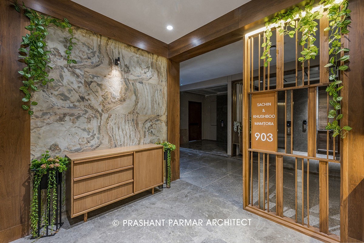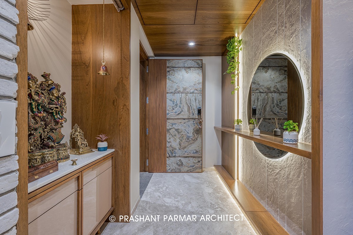 The personal foyer is decorated with wooden partition consisting of voids and solids with the name plate engraved in it. The console unit here is highlighted with the stone cladded backdrop. And the same is reflected in the vestibule having a circular mirror with back lighting. The Material, Lighting and the Furniture gives a touch of Luxury to the Entrance and The Sculpture of “Radha and Krishna” spreads the Spirituality and Love across the House.
