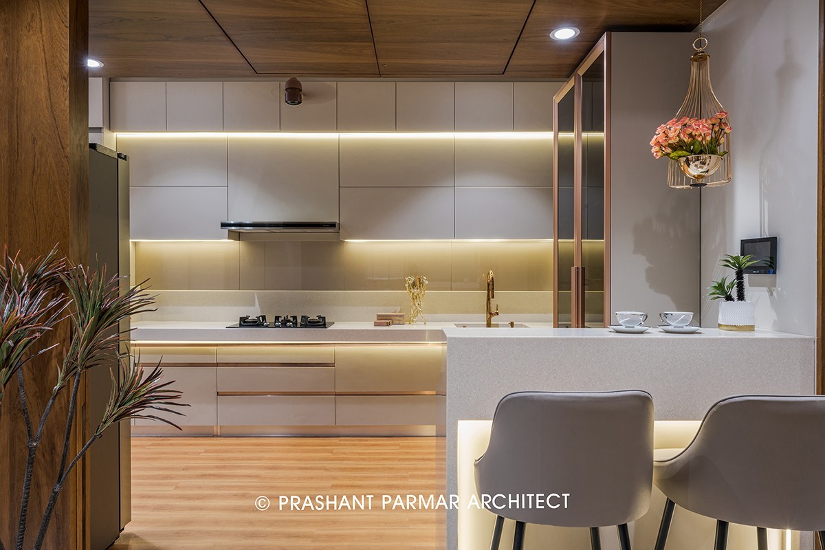 The service platform separates the kitchen from the open plan layout of dining and drawing. To give the minimalist look to the kitchen, it is decorated with matt finish Acrolam cabinets and highlighted vinyl wood flooring. The dining with marble top and grey upholstery adds luxury to the space.