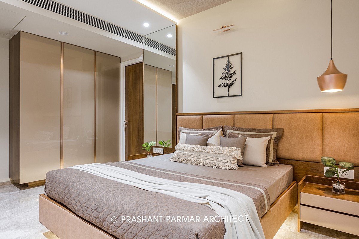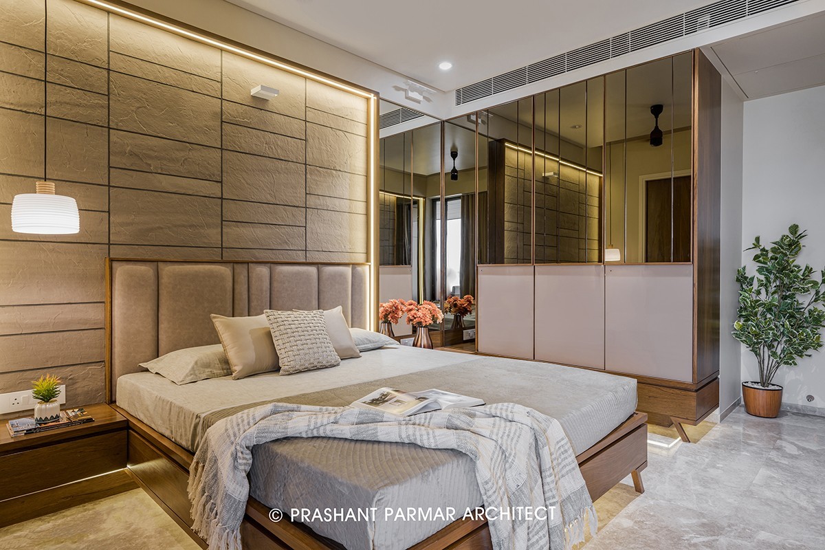 The room next to drawing room is Guest Bedroom having a subtle colour scheme with grey headboard, grey stone backdrop combined with veneer. Use of Bronze Mirror & PU Finish on wardrobe breaks the monotony of the room, making it look spacious.