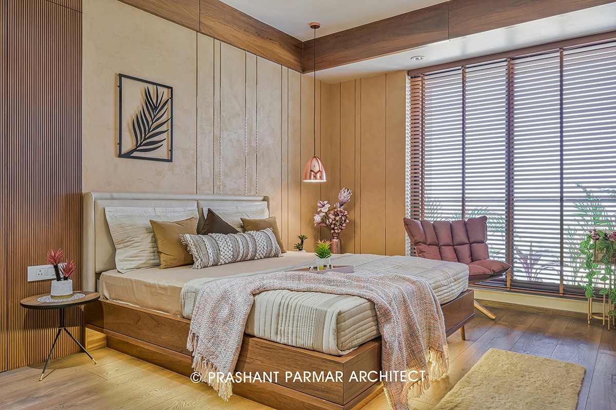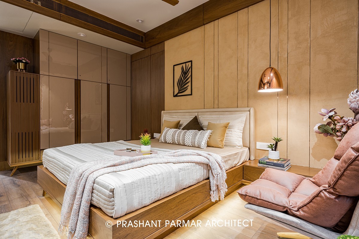 In the Master Bedroom, the cement sprayed backdrop with a tinge of mustard is adorned with vertical rose gold metal patti where the toilet door is beautifully flushed with vertical relwood. Use of light colours on wardrobe and headboard balances the colour theme. Combination of these elements adds royalty to the space.  A provision for storing used clothes is designed as an extension of PU Finish Laminated wardrobe. A refreshing cup of tea can be enjoyed in the beautiful standing balcony with plants which also keeps the room connected with nature.