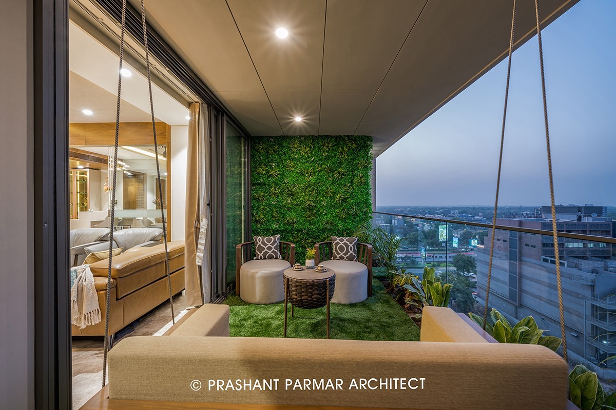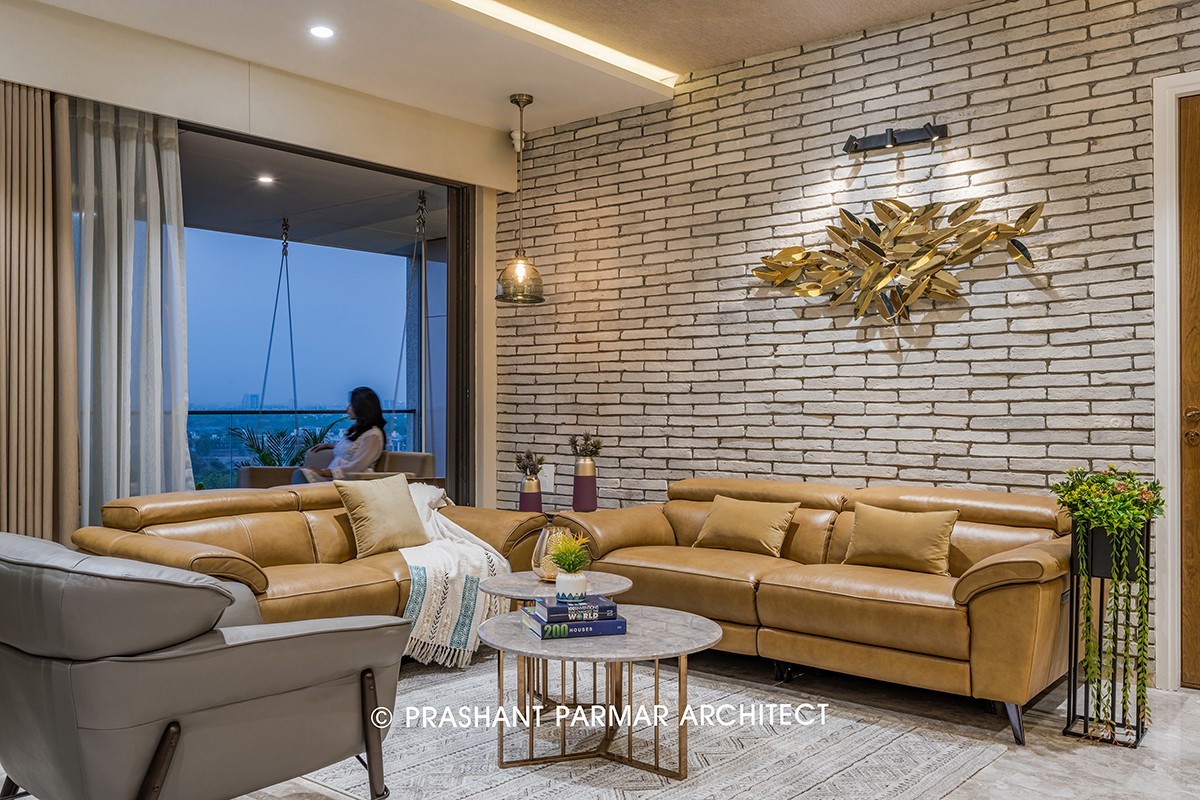 The interiors follow a subtle colour scheme, highlighting the luxurious Italian marble flooring, rich materials and exquisite décor details. The wall of drawing room is cladded with grey toned bricks. The combination of camel and grey coloured leather sofa adds luxury and comfort to the space. The TV Unit wall is embedded with Modified Stone look cladding in grey tone which looks mesmerizing. Marble top Centre Table compliments the shades of curtains. The Garden balcony with vertical green wall and swing looking towards the oceanic views of green creates a soothing ambience which also connects the Guest Bedroom.