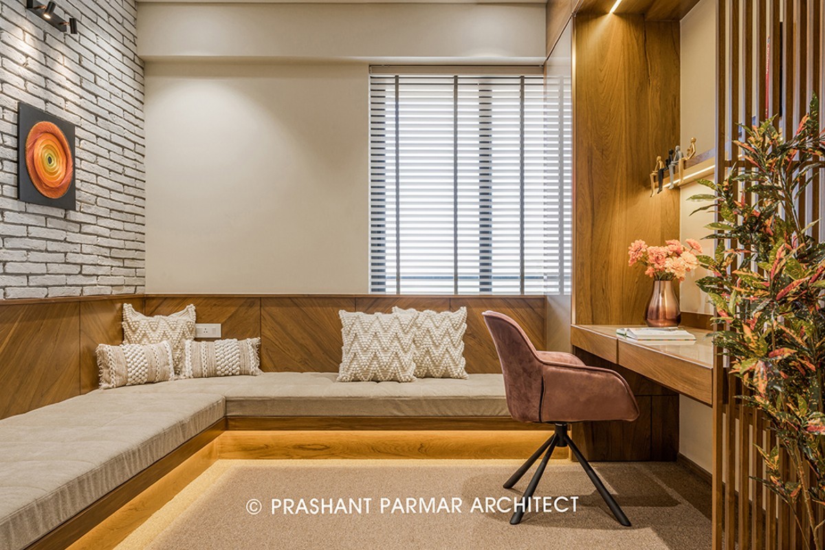 Continuity in materiality and colour selection is reflected from drawing room to every corner of the house. The sliding glass doors are purposefully designed within the spaces to make apartment look spacious. The Indian low height seating act as a informal sitting for family members to chill, having study table to read or work a little. The wooden partition besides the study creates a partial privacy partition. Again, we can see that the drawing room and family sitting follows a same theme of grey brick cladded wall.
