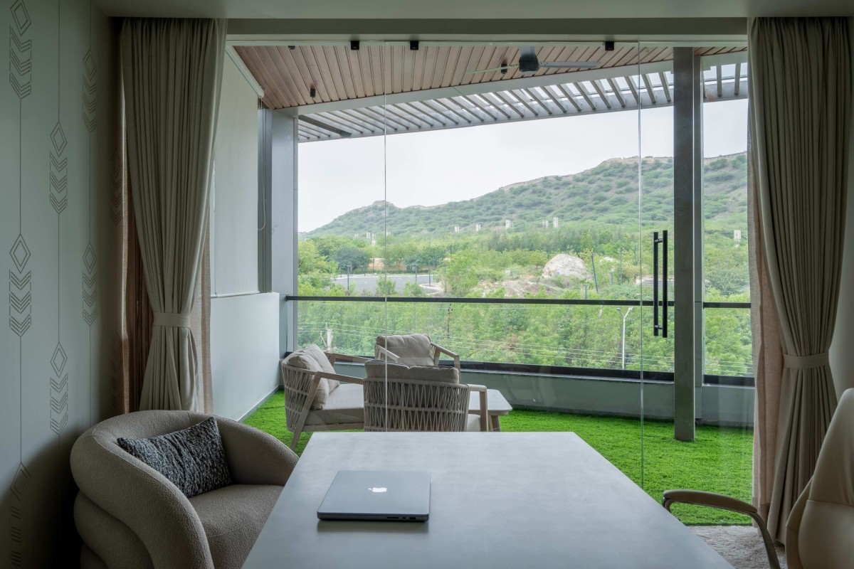 Director's cabin overlooking lush green hill view of Ashapura China-clay Office by Studio Revah
