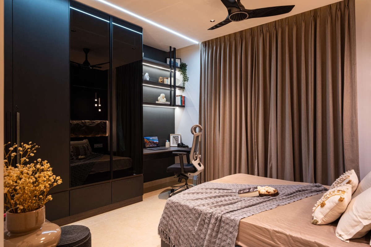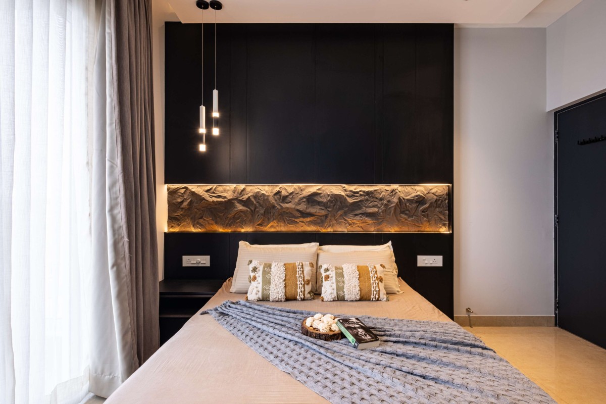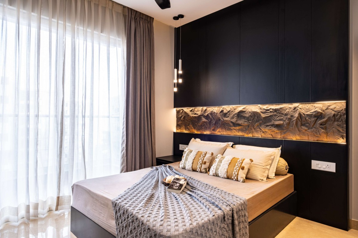 The daughter’s bedroom is designed as a bold yet elegant retreat. A striking black accent wall becomes the defining feature, animated by a sculptural, textured panel with integrated backlighting. This element doubles as both artwork and illumination, transforming the room into a dramatic yet cozy space. The bed is dressed in neutral linens with muted gold accents, while sheer curtains allow filtered daylight to soften the darker tones. This balance of boldness and warmth reflects a refined interpretation of youthful sophistication.