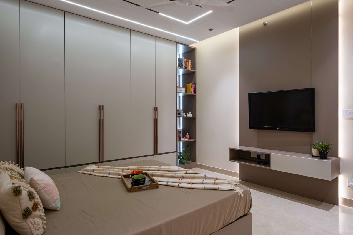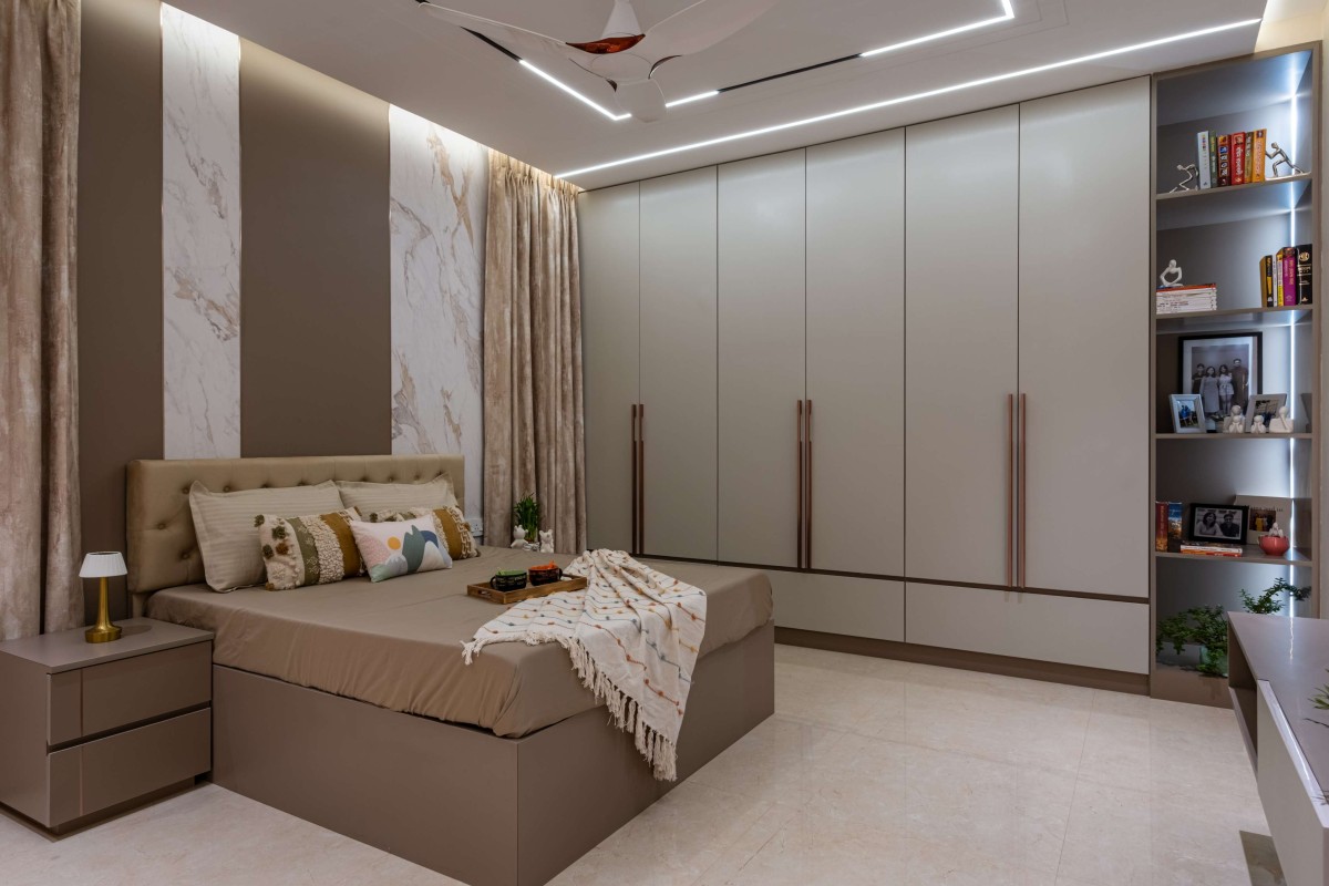 The master suite is conceived as a tranquil escape, with beige-toned walls, upholstered headboard, and soft linen textures creating a restful ambiance. Minimalist furniture with clean lines and concealed storage solutions reinforces functionality. Layered lighting—combining warm ambient cove lights with bedside task lamps—sets a soothing tone, making the space a true sanctuary.