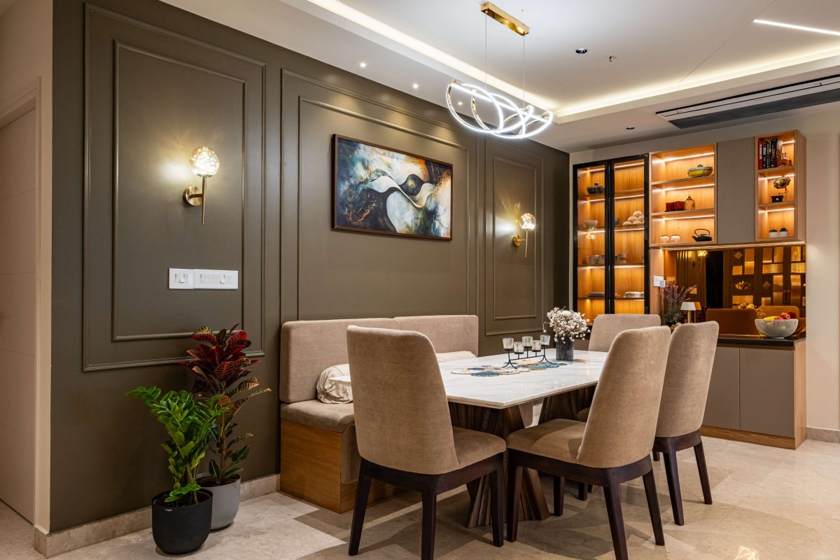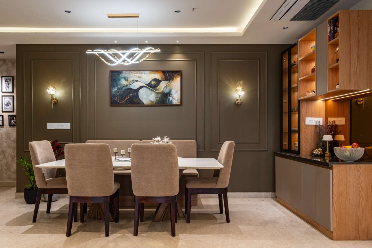 The back wall is articulated with panel molding in muted tones, adding depth and classic refinement. A statement contemporary chandelier above the dining table acts as both a sculptural element and a light source, reinforcing the design’s focus on functionality married with artistry.
