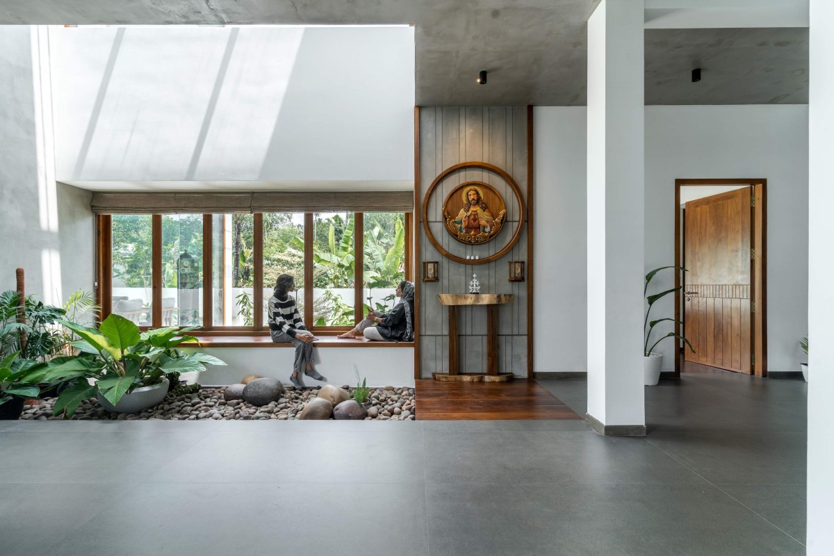 Long slit windows and multiple skylights generously bath the interior in natural light, imbuing the space with a warmth reminiscent of a sun-kissed meadow. Talking about the material palette, it’s basically shades of greys and browns and more of the textures, as the original texture of the material has its own language.
