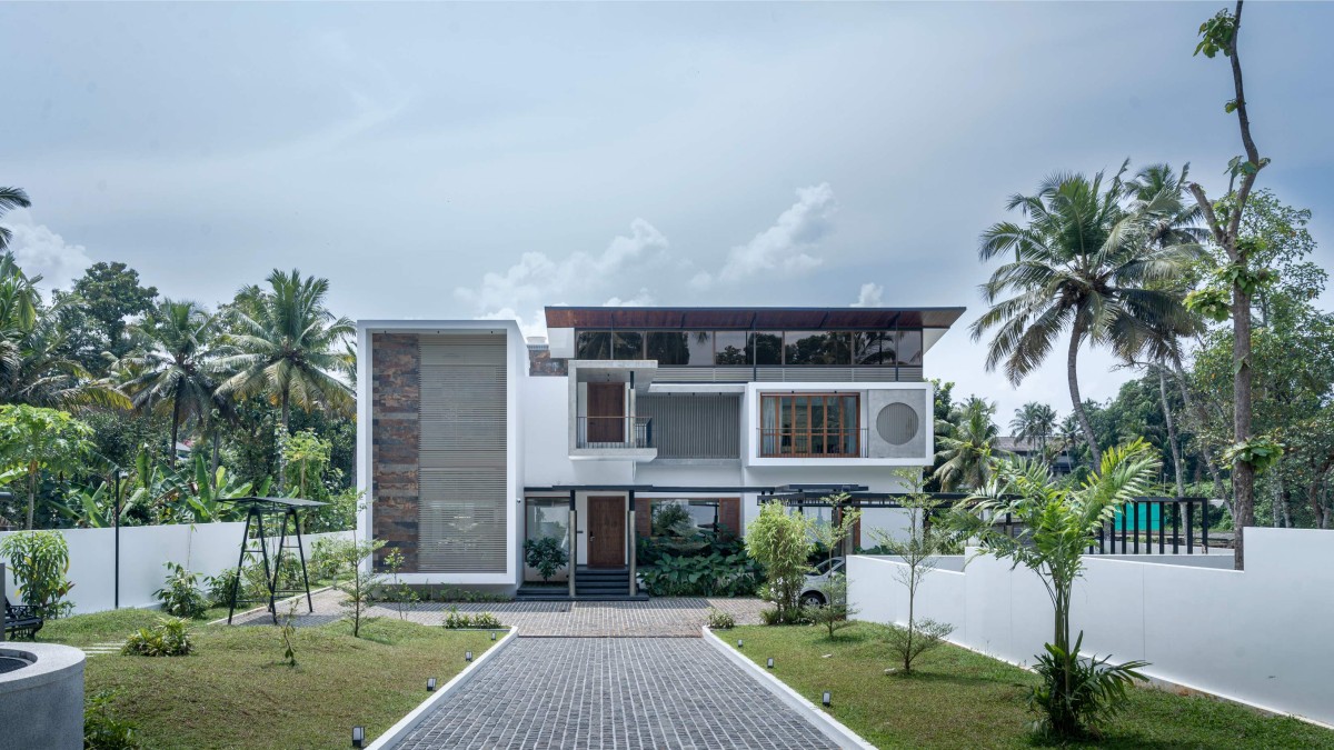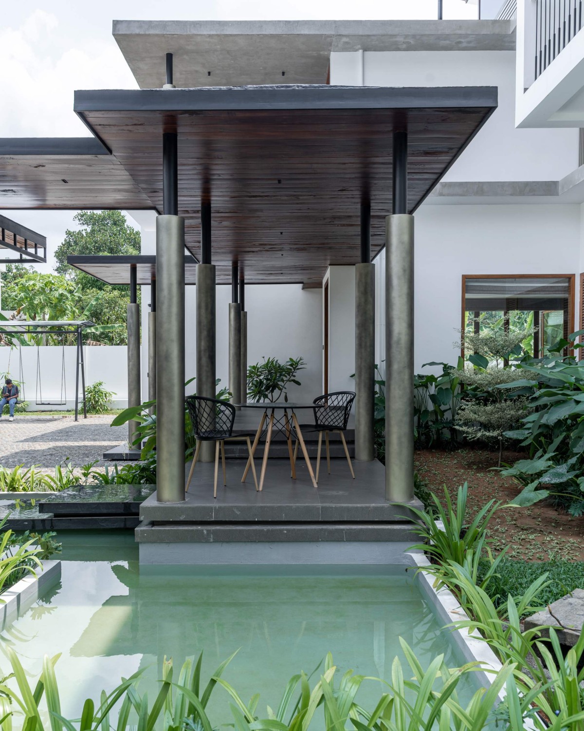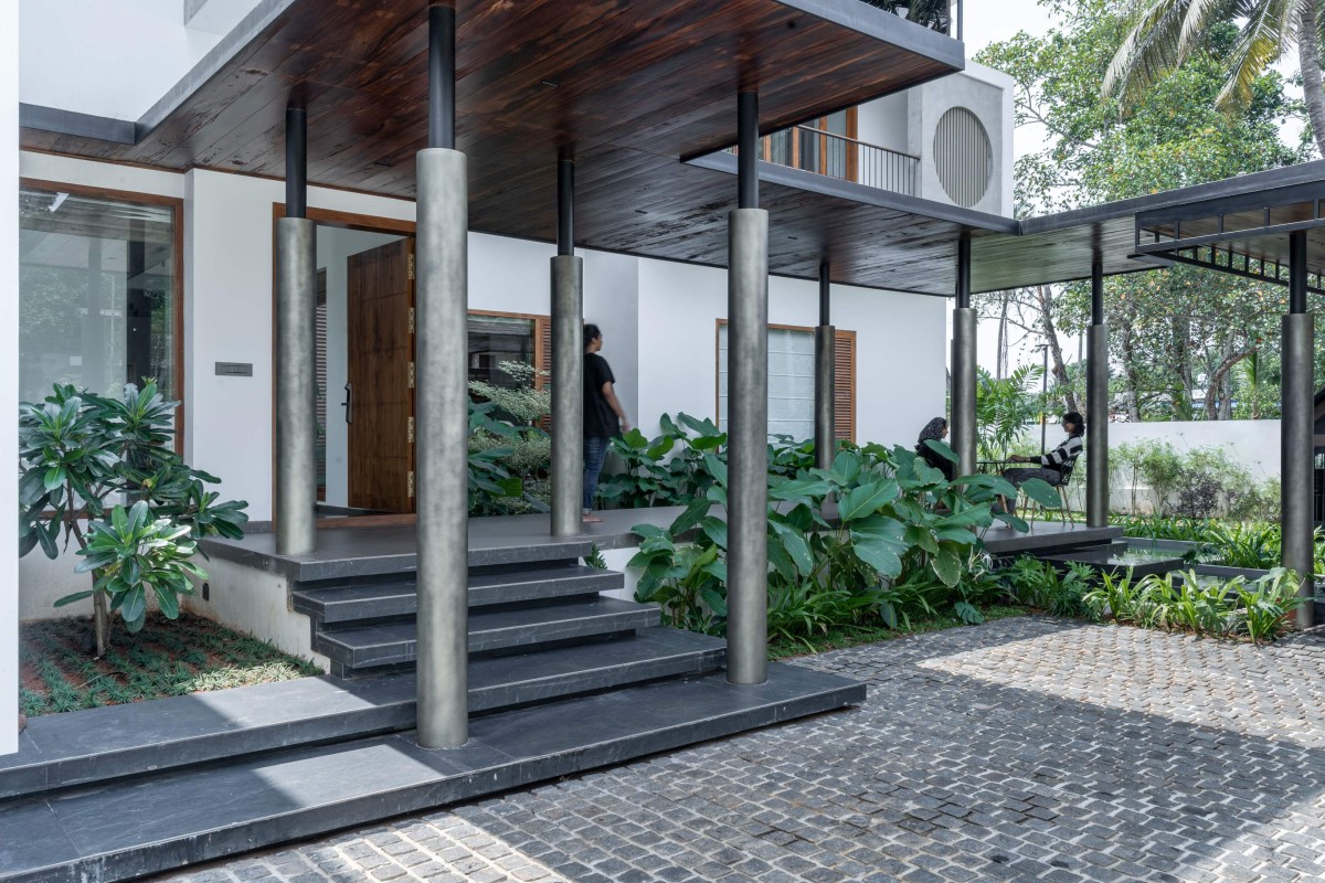 The water feature at the entrance of the house set a tone of tranquillity for the well-designed open plan double volume spaces and also help the residence stay cool in the hot summer months. This natural cooling technique takes the load off of the artificial cooling system and surely would aid in cutting back on the power bill. The entrance steps floating over a pond the double volume window behind it create a balance of elements. The roof over the entrance foyer is made up of steel structure supported by metal columns.