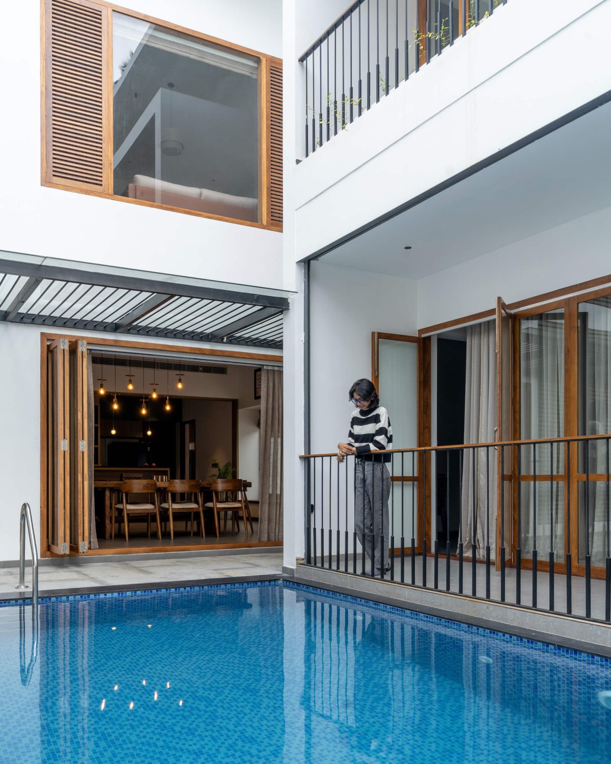 Embracing the art of outdoor living with this stunning deck and pool oasis, our little slice of paradise is the perfect blend of relaxation and entertainment. The deck, adorned with stylish furniture and cosy nooks, beckons for lazy afternoons and lively gatherings with friends and family. The exquisite scenery of the pool is accessed from dining and bedrooms. From sunrise to sunset, this space is a haven of tranquillity and joy. This bedroom patio is a tranquil retreat featuring a stylish deck and a dreamy pool. The deck, bathed in natural light, invites you to unwind with a good book or bask in the warmth of the sun. Whether it's a leisurely float or an invigorating swim, this is where relaxation meets recreation. The play of natural light dances upon the carefully curated space, creating a serene atmosphere that invites calm and introspection.