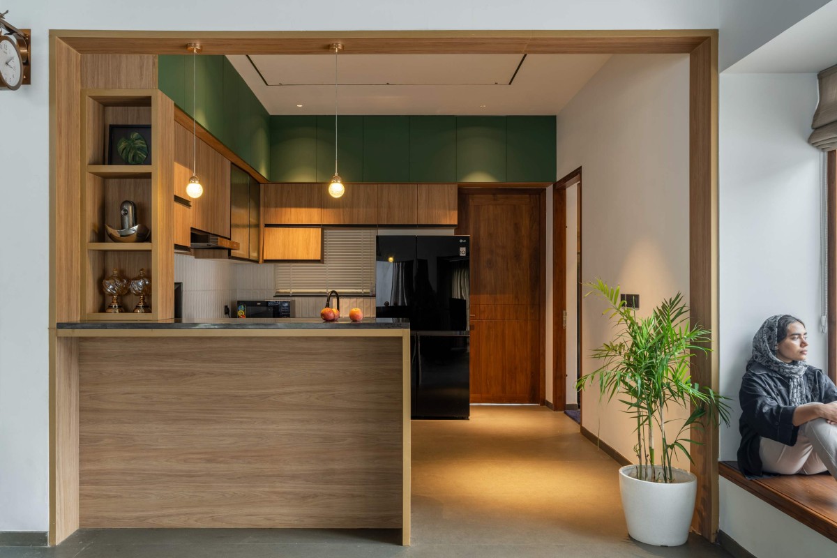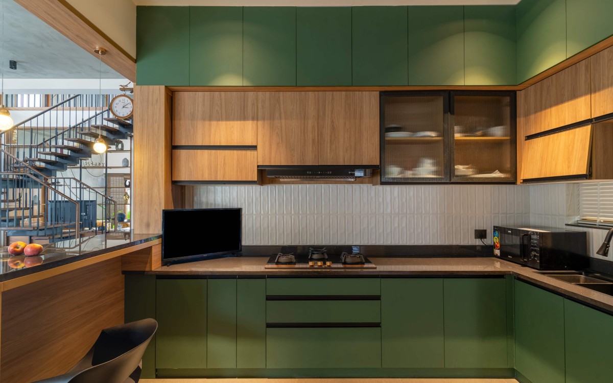 The kitchen gives a glimpse of subtle green cabinets accented with a warm wood tone. Countertops are installed with a terrazzo textured Quartz. The white Dado tiles has been used for the backsplash. The entire kitchen is kept limited to solid colours but with a splash of design on the flooring. The landscape is never finished as they continue to evolve over the course of time.