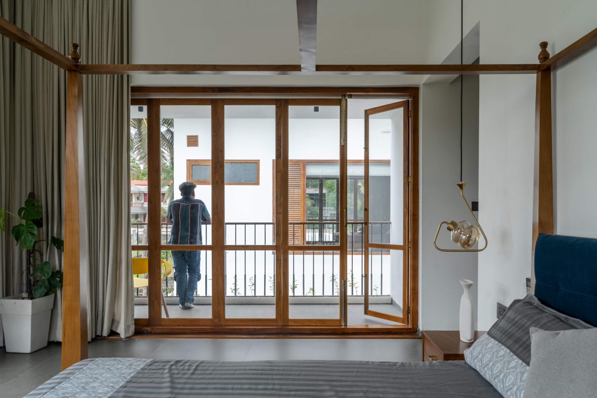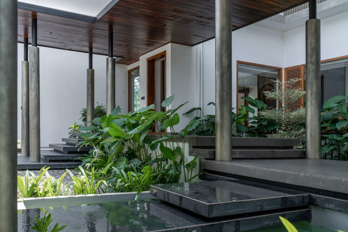 The open dining area closest to the stair is well-ventilated and light-filled, with access to the outdoor swimming pool. The wide path that leads to the pool makes the dining space more spacious and provides a nice breeze to enjoy while having the food. The ‘last supper frame’ and the fabric finish in the ceiling is the highlight of this space. Teak wood makes up every single piece of furniture in the eight-seater dining room. The open-plan layout of the common areas abstains from a conventional partitioning with walls in favour of split levels.