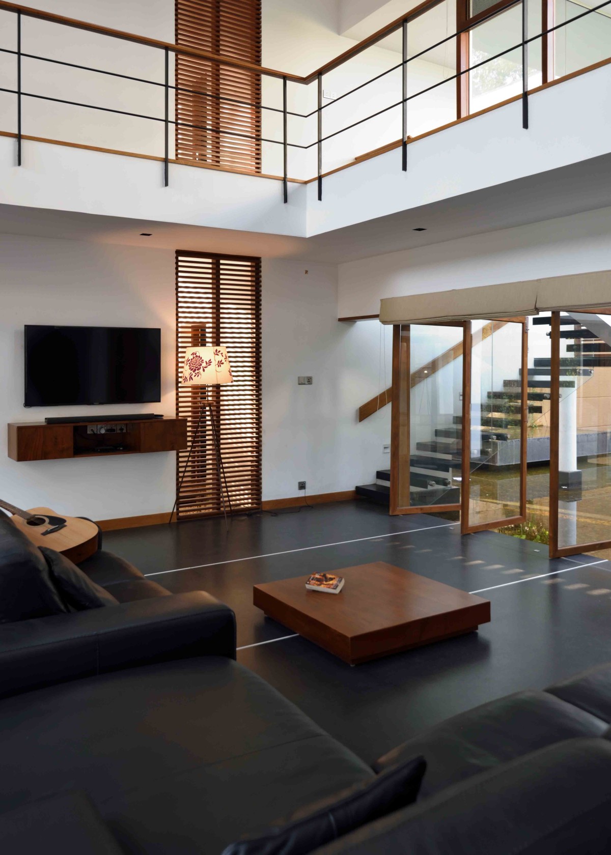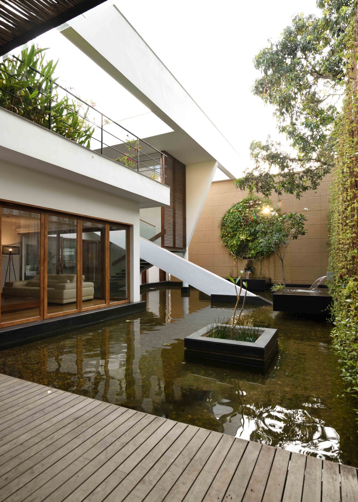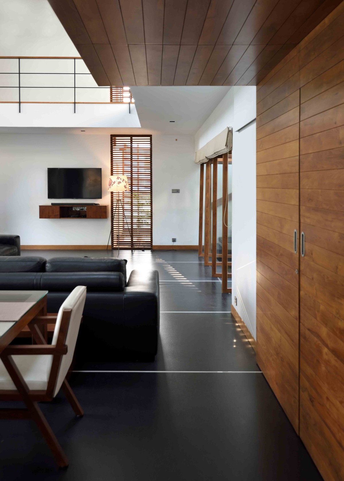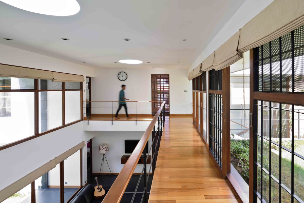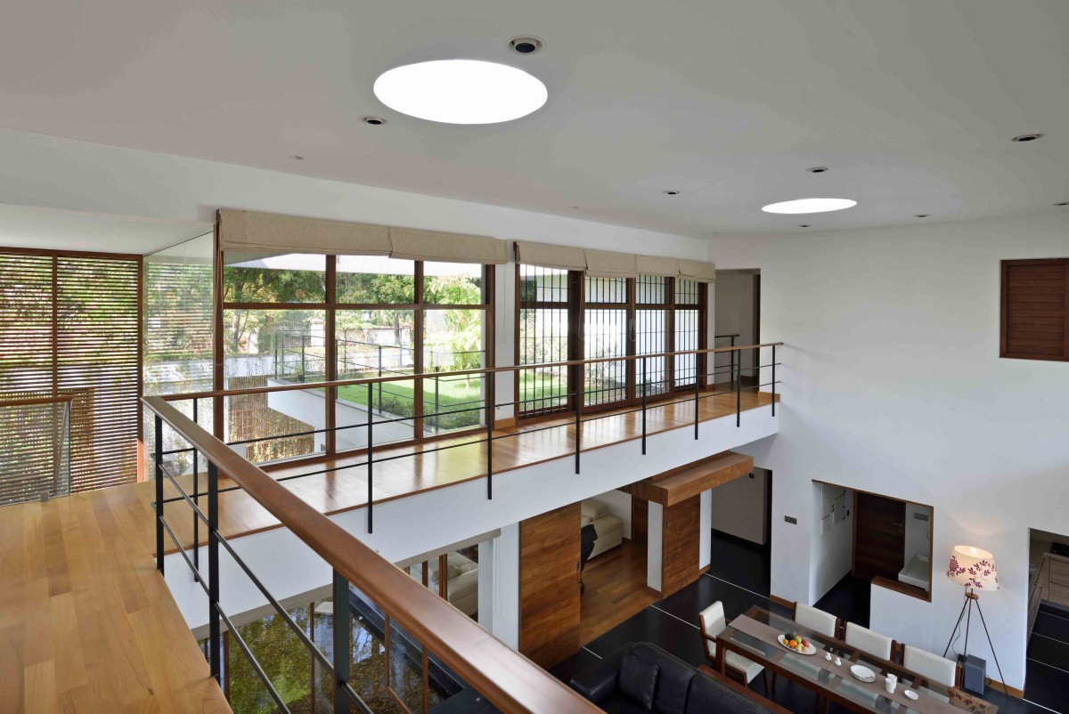 The layout of this home is articulated in such a way that each room with specific functions gets a view towards a water pool in the north or a large garden in the south. The core of the home is the double height family living/dining which extents out to the water pool in the north and garden in the south. Abundance of natural light and cross ventilation is harnessed in this area though the use of large sliding and pivot operable glass shutters with timber frames on either sides respectively. The perched up wooden passage in this area enables the connection between various activities on the above floor.