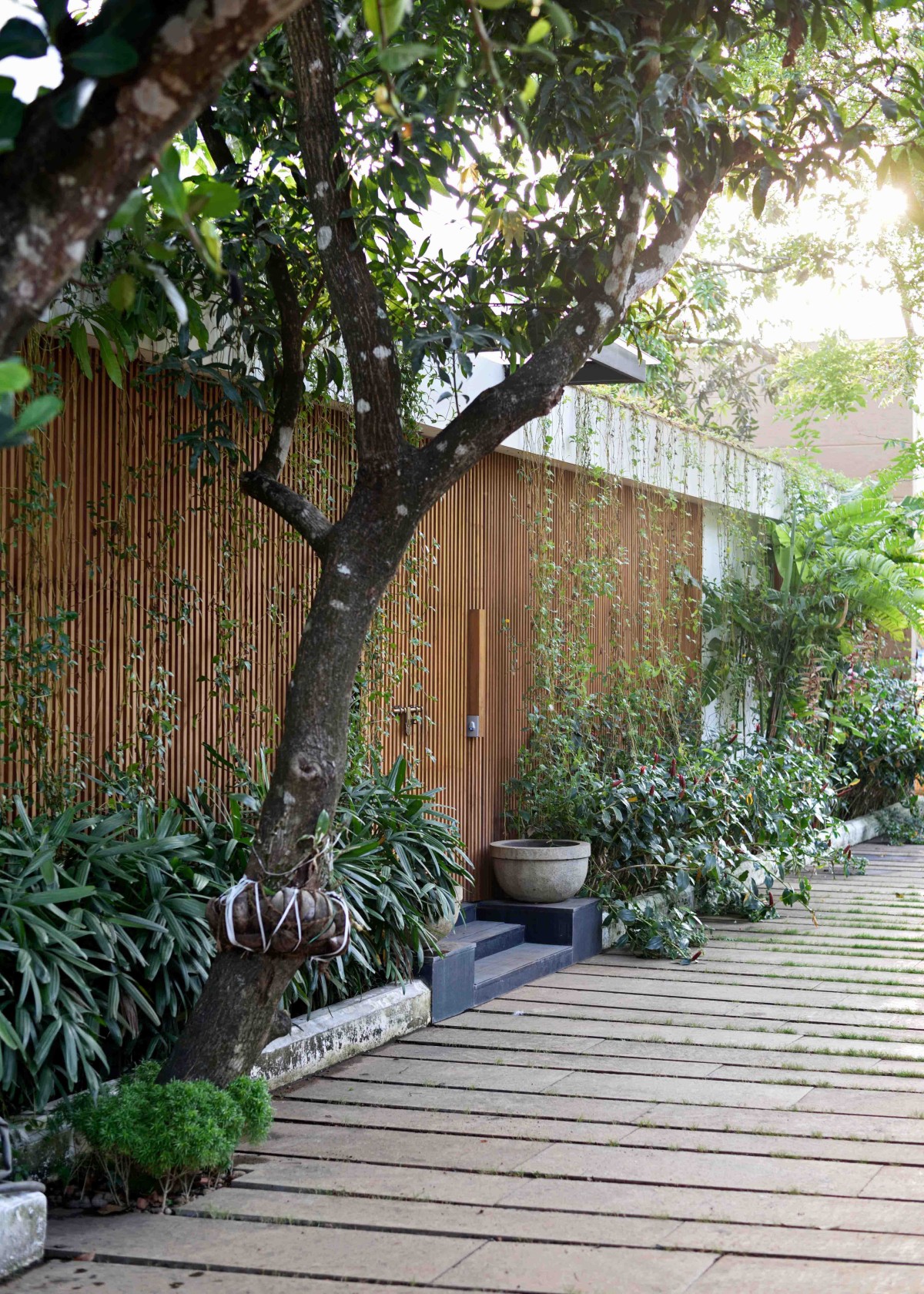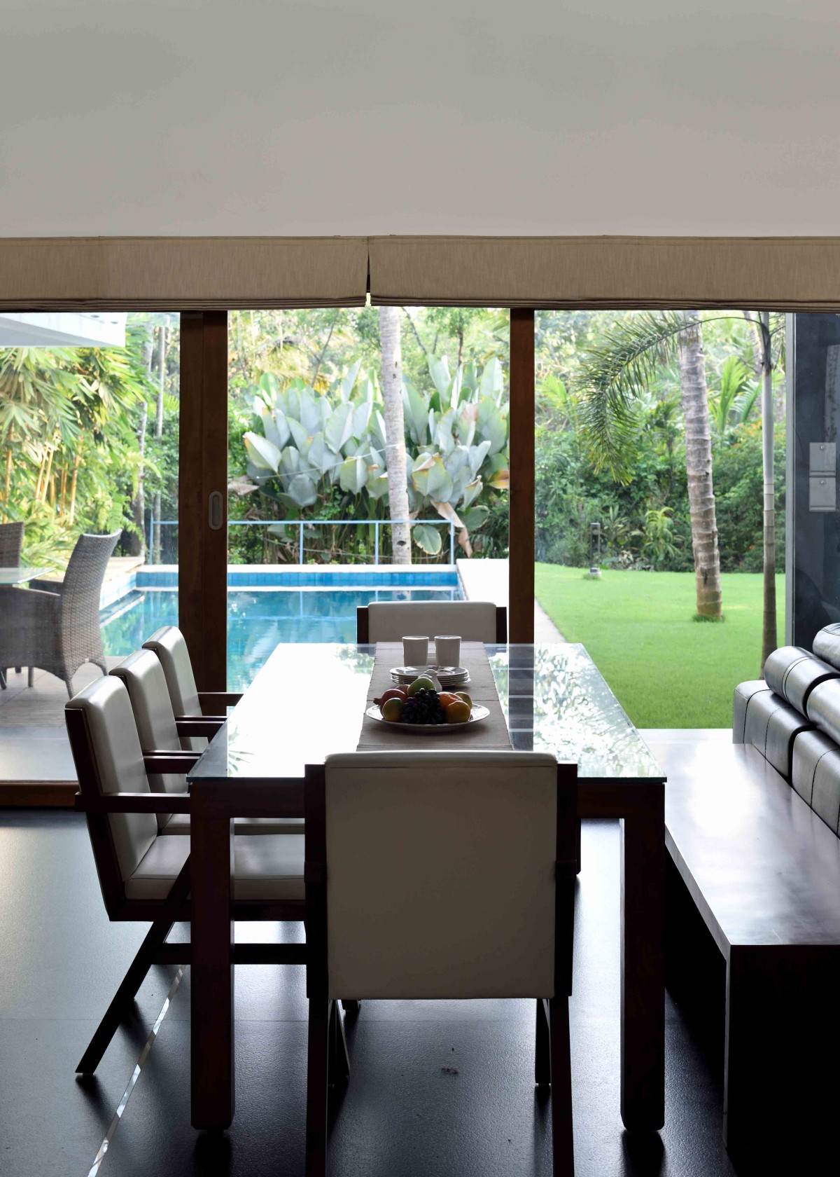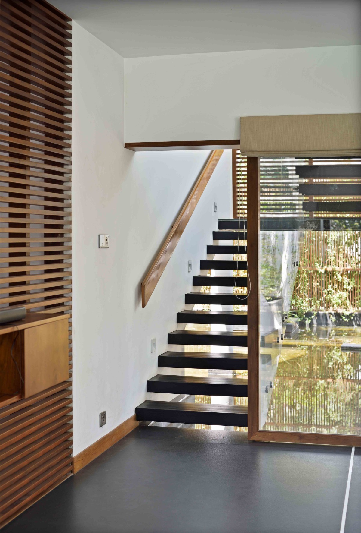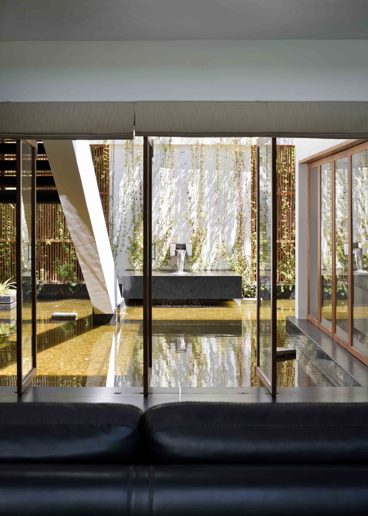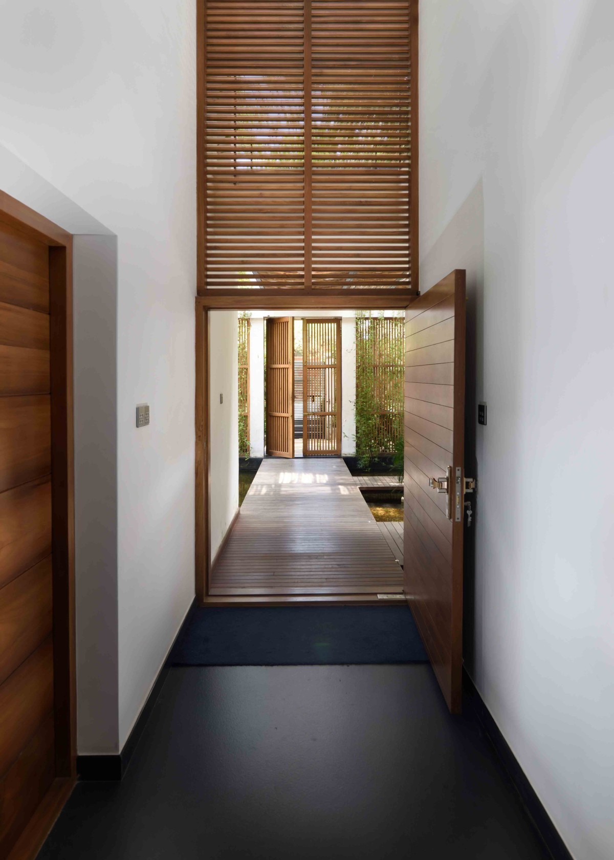 The layout of this home is articulated in such a way that each room with specific functions gets a view towards a water pool in the north or a large garden in the south. The core of the home is the double height family living/dining which extents out to the water pool in the north and garden in the south. Abundance of natural light and cross ventilation is harnessed in this area though the use of large sliding and pivot operable glass shutters with timber frames on either sides respectively. The perched up wooden passage in this area enables the connection between various activities on the above floor.