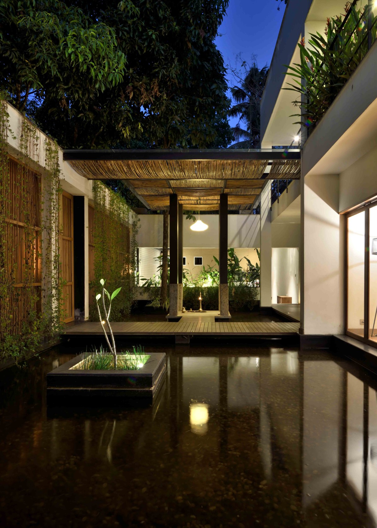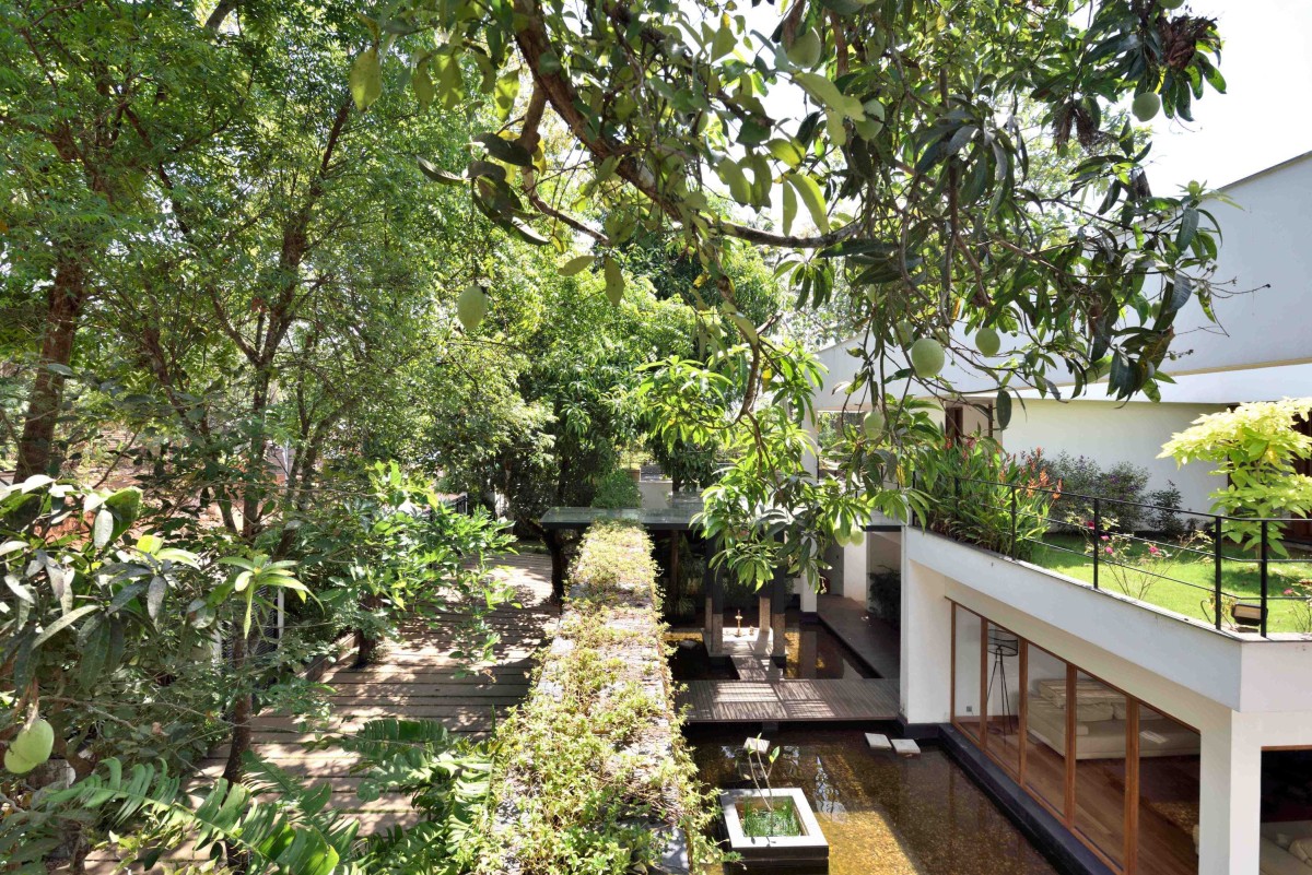 The house was conceived for a hardware trader and his family of 2 kids and wife in the village of Puthoor in Kottarakkara, Kerala. There was an old house in the site which was demolished to construct the new one. All trees within the site were left as it is, as part of the landscape. The north facing frontage of the plot had beautiful shade offering trees some of which lean over the house and pool offering maximum shade from the relentless summer sun. Even though the property has its longer side facing the east-west direction, the building is designed so that the longer side faces the North and South with its major openings facing the waterbody screened by a wooden slats wall on the northern side and a large garden and swimming pool on the southern side. The main access road on the north side ramps up to the west from the east where the property level is at par with the road. Fenestrations on the south-western side of the building lets in cool breeze throughout the day keeping the building well ventilated.The timber reapers on the north facade provides discreteness to the home from the street, which is at a higher level towards the western side yet letting in diffused light and air through it.