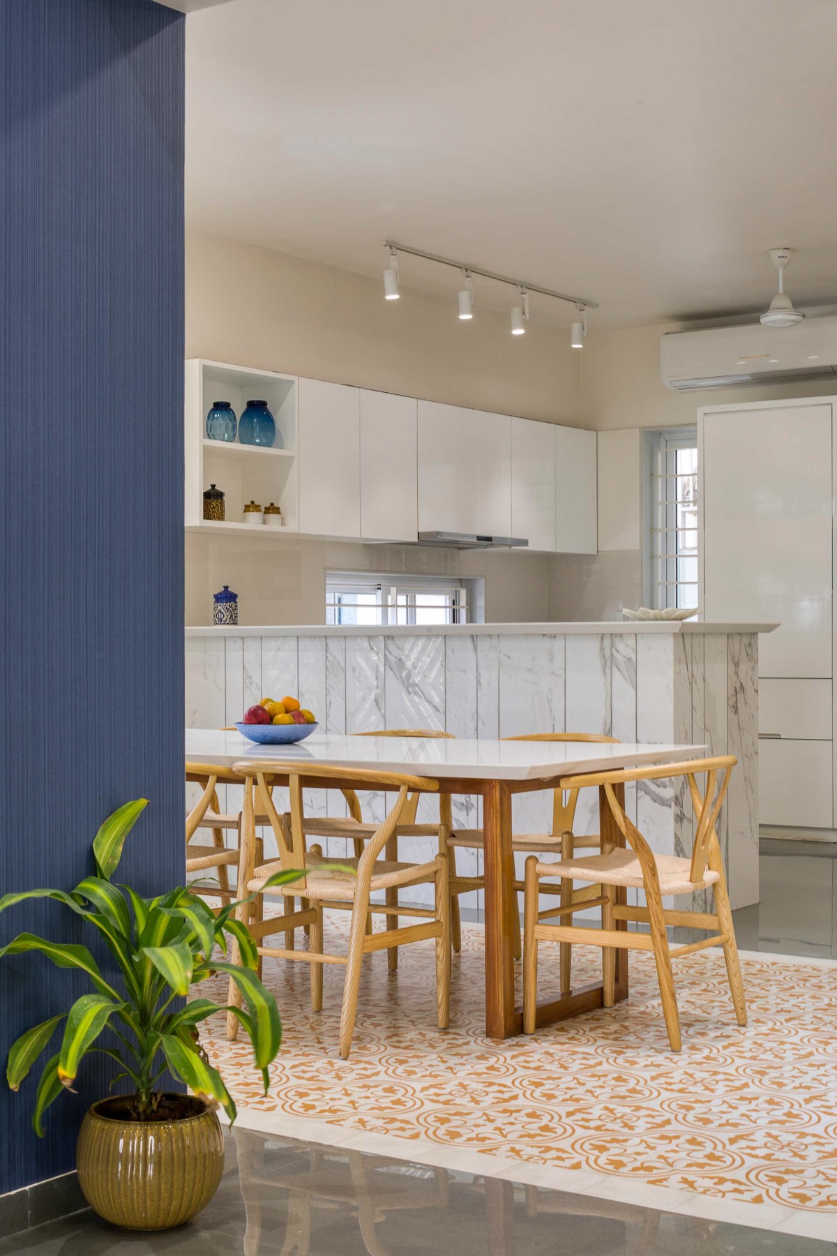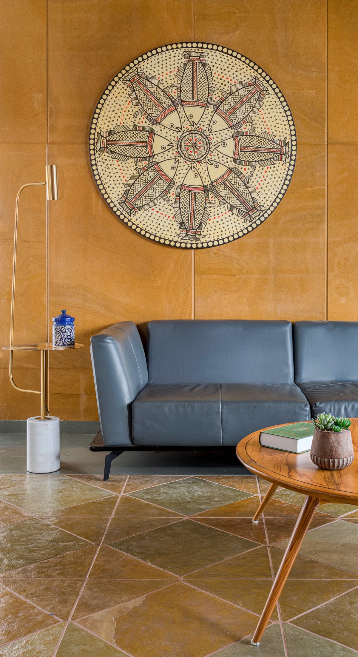 The room features a subtle Indian touch with simple clean lines and sleek furniture. This room also, follows the Yellow – Teal Blue color theme with the furniture in ochre yellow tones and splashes of teal blue in the flooring.