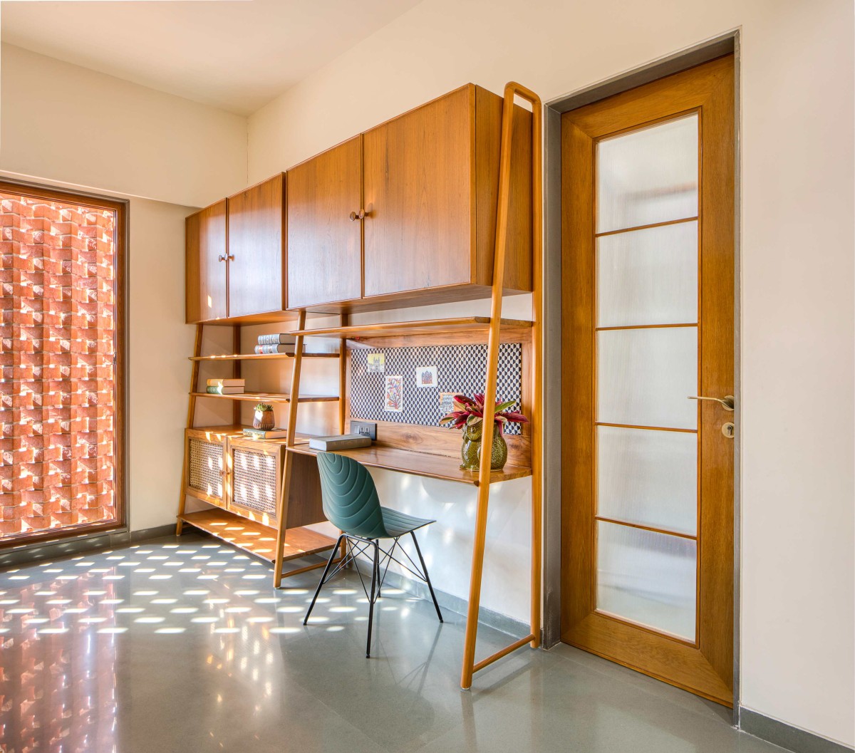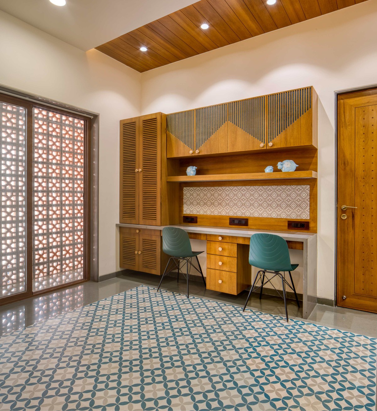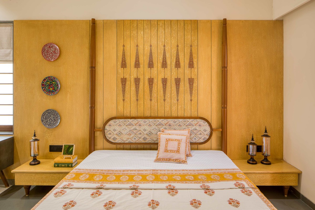 The master bedroom ventures further more into the Indian look with the four poster bed and the custom made study unit with cane netting. It also features a backdrop wall with Shera panelling in yellow toning and a contrasting teal blue and white terrazzo galicha flooring.