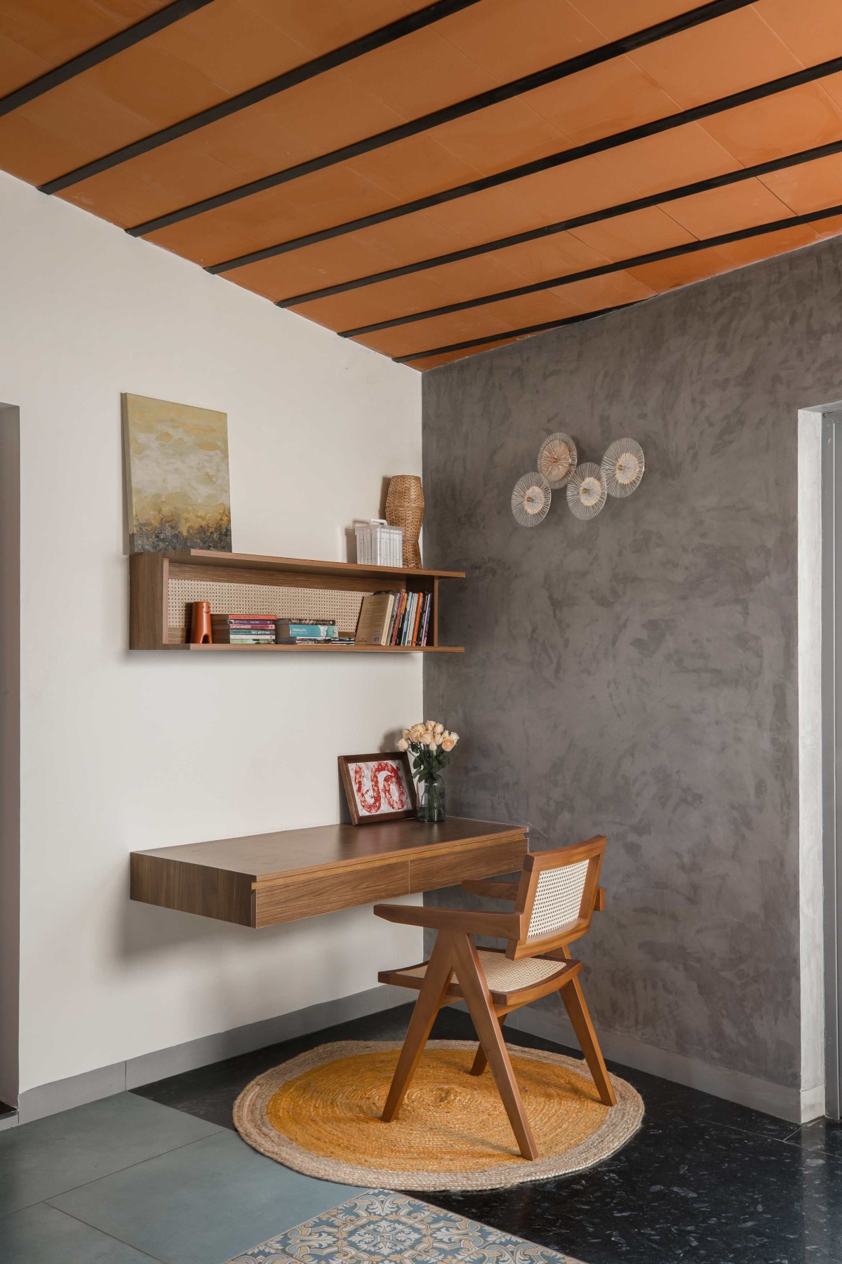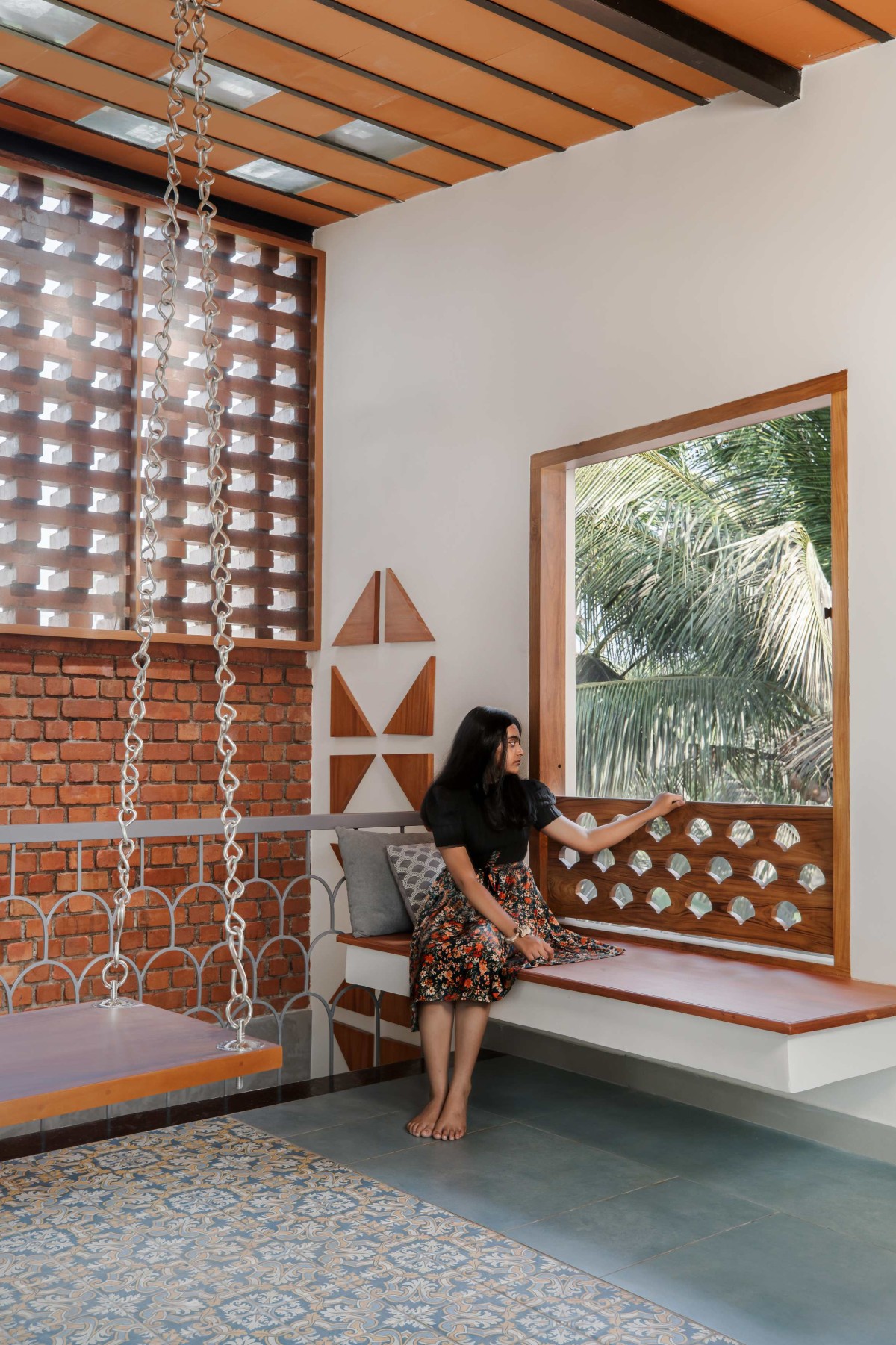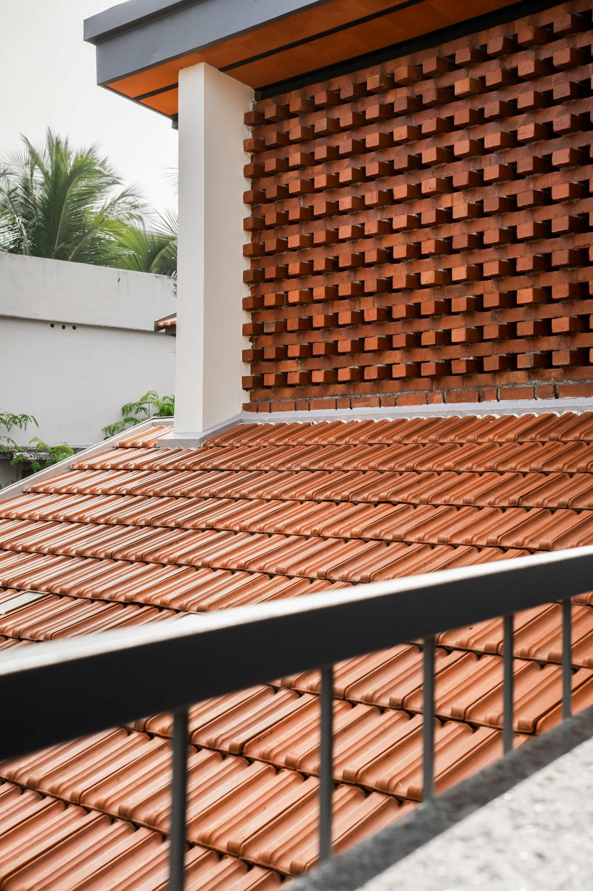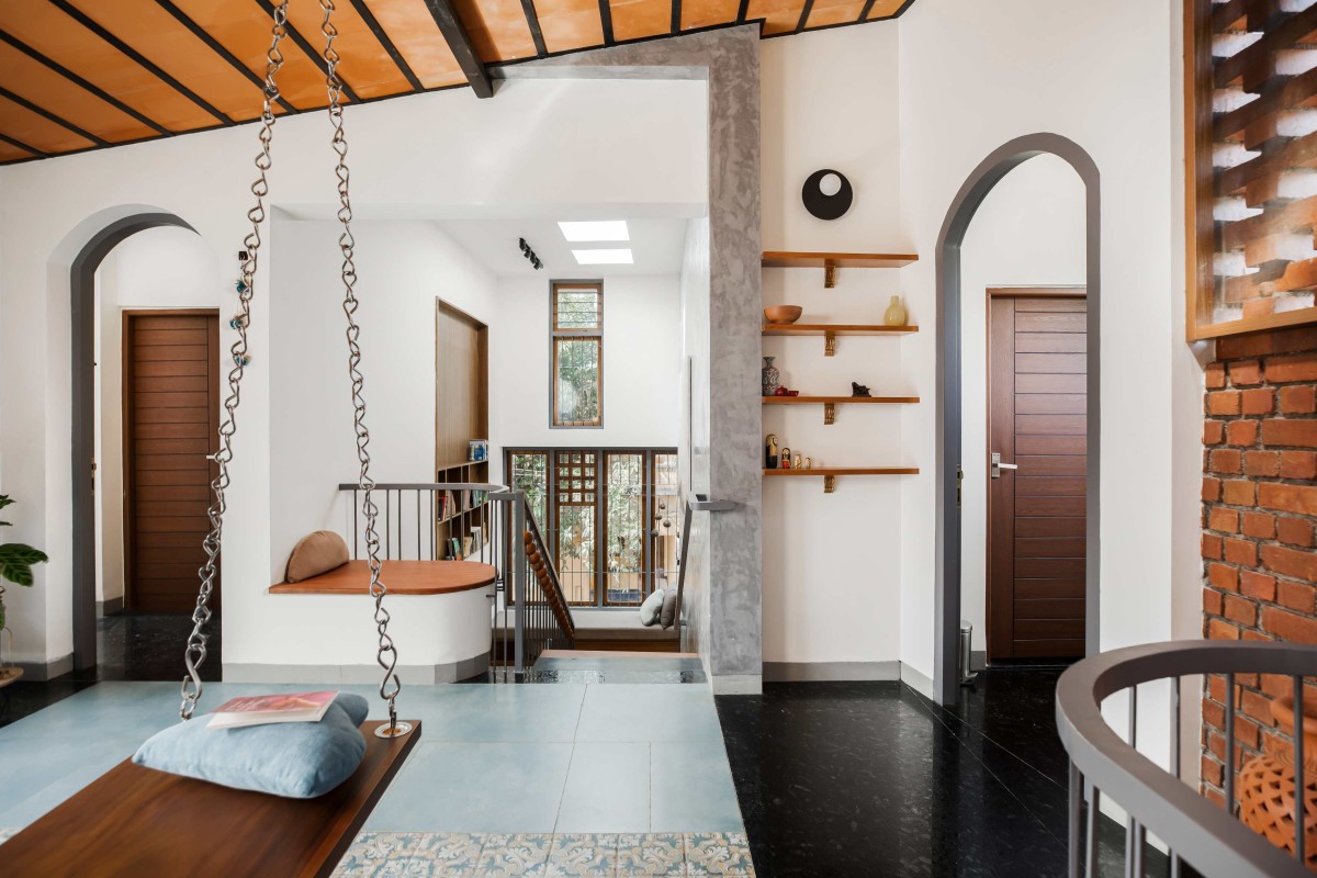 Passive cooling strategies are embedded throughout. Rat-trap bond masonry in the south and west-facing walls creates air cavities that reduce heat transmission, while a double-layered roof system, Mangalore tiles above and terracotta ceiling tiles below, forms an insulating buffer against the sun. The result is a home that remains noticeably cooler, even during peak summer afternoons.