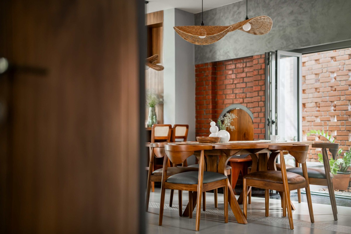 At the heart of this sequence rises a double-height volume above the living and dining areas. Woven pendant lights descend at varied heights, their basketwork casting delicate shadows that drift and dissolve as the day progresses. In Palakkad’s intense summers, this volume performs efficiently as hot air rises and escapes through carefully positioned brick jalis near the ceiling, while cooler breezes from the surrounding paddy fields are drawn inward. A fine wire mesh sits discreetly behind the brickwork, keeping insects out without interrupting the visual rhythm.