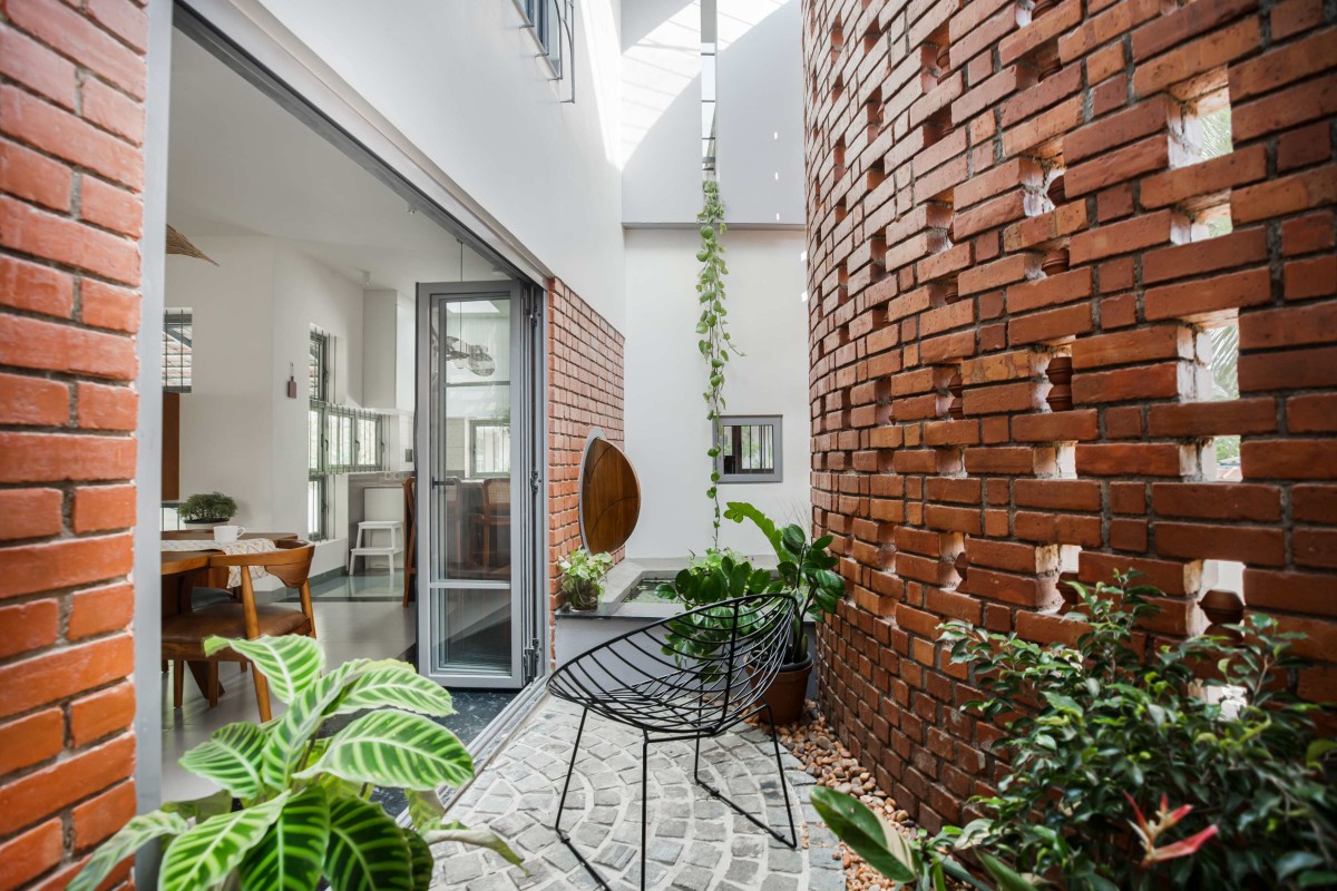 Beyond the living and dining spaces, through folding glass doors, the house opens into its most evocative pause: the patio. Designed as an inward-looking courtyard, it exists between enclosure and openness, defined by a semi-circular, double-height brick jali wall. From within, it becomes a focal point as the wall follows a deliberate pattern, bricks are arranged to create voids that increase in frequency as the eye travels upward, allowing more light and air at the top where heat naturally accumulates. Nestled within the voids are small terracotta pots, tucked in like birds in a nesting wall, disrupting predictable shadow patterns and adding moments of surprise.