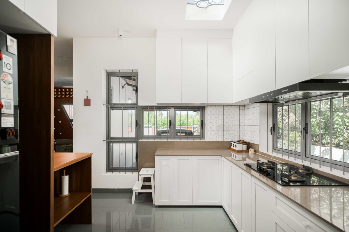 The dining space anchors this volume. A generous table sits beneath the cascade of pendant lights, becoming a natural gathering point, where meals stretch into conversations. From here, the kitchen remains close enough to feel connected, yet discreetly positioned to avoid visual clutter. The kitchen reveals itself gradually. Bathed in daylight from a skylight carved into the ceiling, it feels bright and calm rather than utilitarian. White cabinetry rises against the walls, softened by subtle profile details, while open wooden shelving introduces warmth and texture. Windows frame pockets of greenery beyond, allowing light and ventilation to shape the space throughout the day. Even the utility areas continue this logic of care. Another skylight brings daylight deep inside, while high windows with metal grills ensure ventilation and privacy.