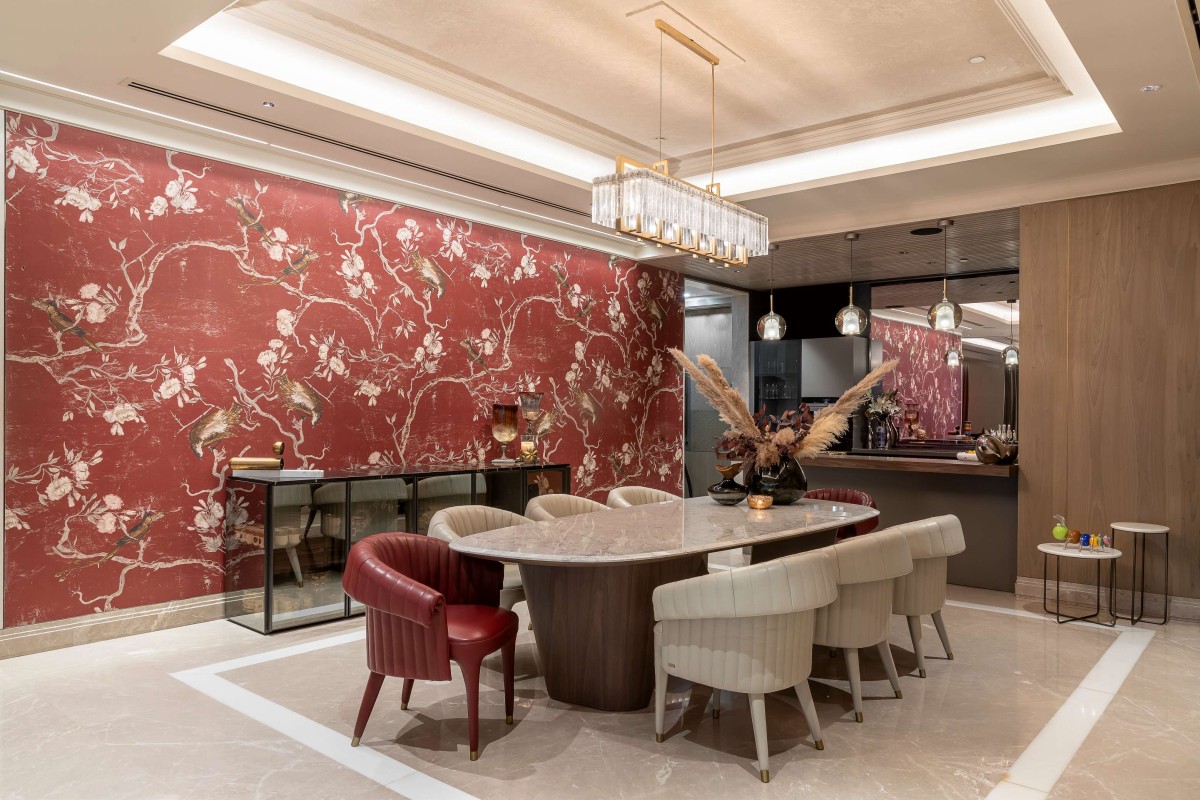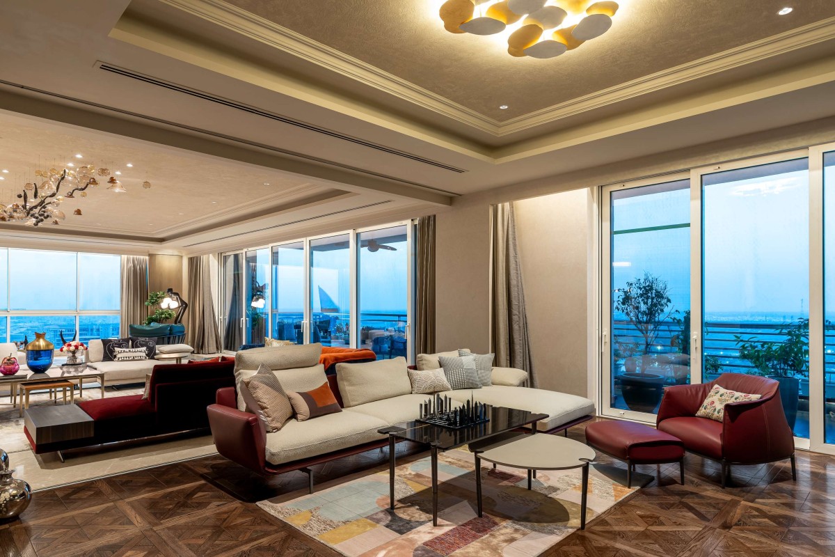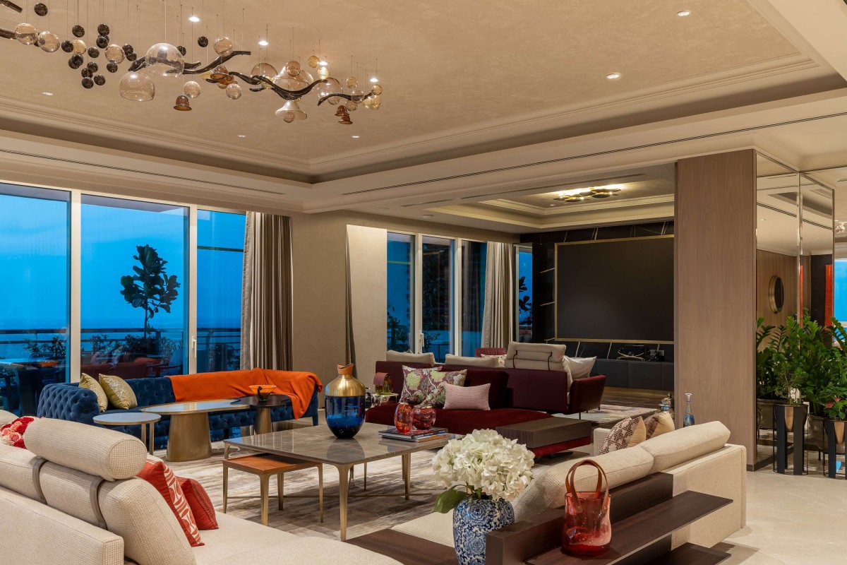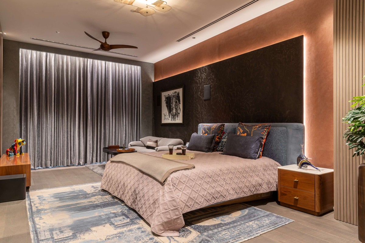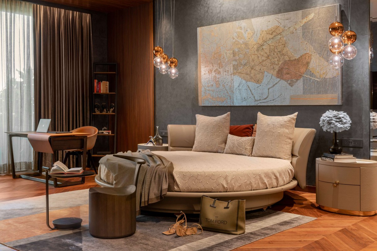 In a space that celebrated minimalism and contemporary aesthetics, the master bedroom was the exception. Inspired by the opulence of Versace, it embraced patterns, colours, and a design language synonymous with the brand. The bathroom, in particular, embodied the essence of Versace, with a mesmerising Medusa inlay forming the floor's centrepiece. Black, gold, and beige hues enriched the bathroom, seamlessly merging Versace's opulence with contemporary design sensibilities. A prominent feature of the home was the stunning light installation in the living area—a Pressyosa that captivated the entire room! It served as a focal point, dividing the living space into two distinct seating arrangements while providing ambient lighting that beautifully illuminated the space.