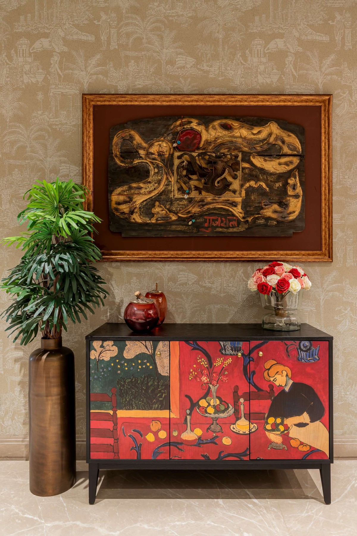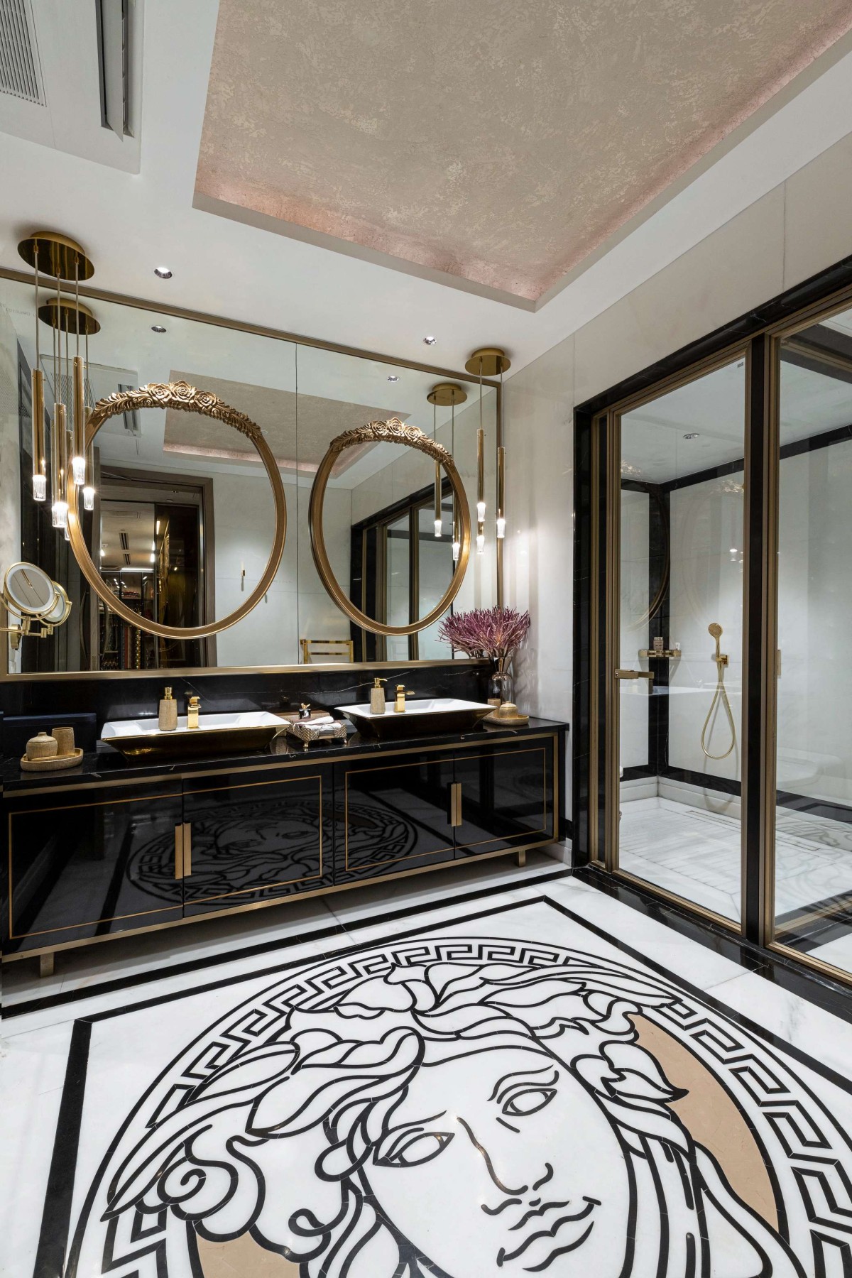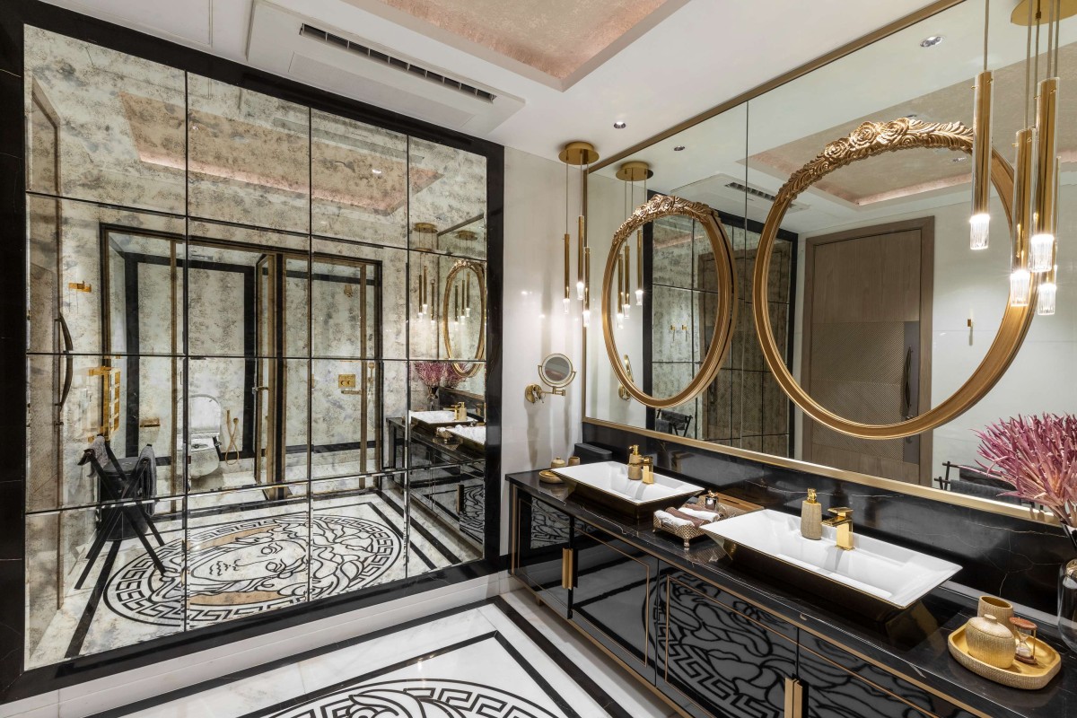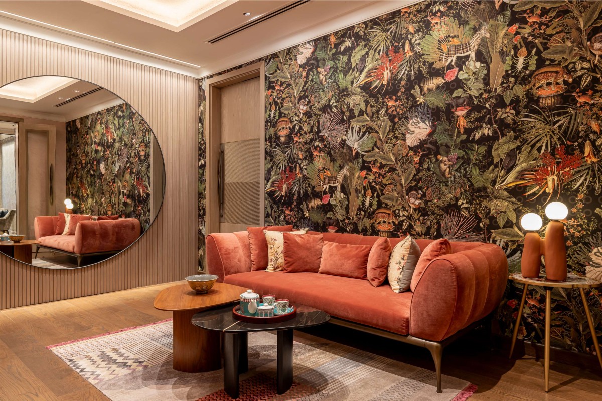 In a space that celebrated minimalism and contemporary aesthetics, the master bedroom was the exception. Inspired by the opulence of Versace, it embraced patterns, colours, and a design language synonymous with the brand. The bathroom, in particular, embodied the essence of Versace, with a mesmerising Medusa inlay forming the floor's centrepiece. Black, gold, and beige hues enriched the bathroom, seamlessly merging Versace's opulence with contemporary design sensibilities. A prominent feature of the home was the stunning light installation in the living area—a Pressyosa that captivated the entire room! It served as a focal point, dividing the living space into two distinct seating arrangements while providing ambient lighting that beautifully illuminated the space.