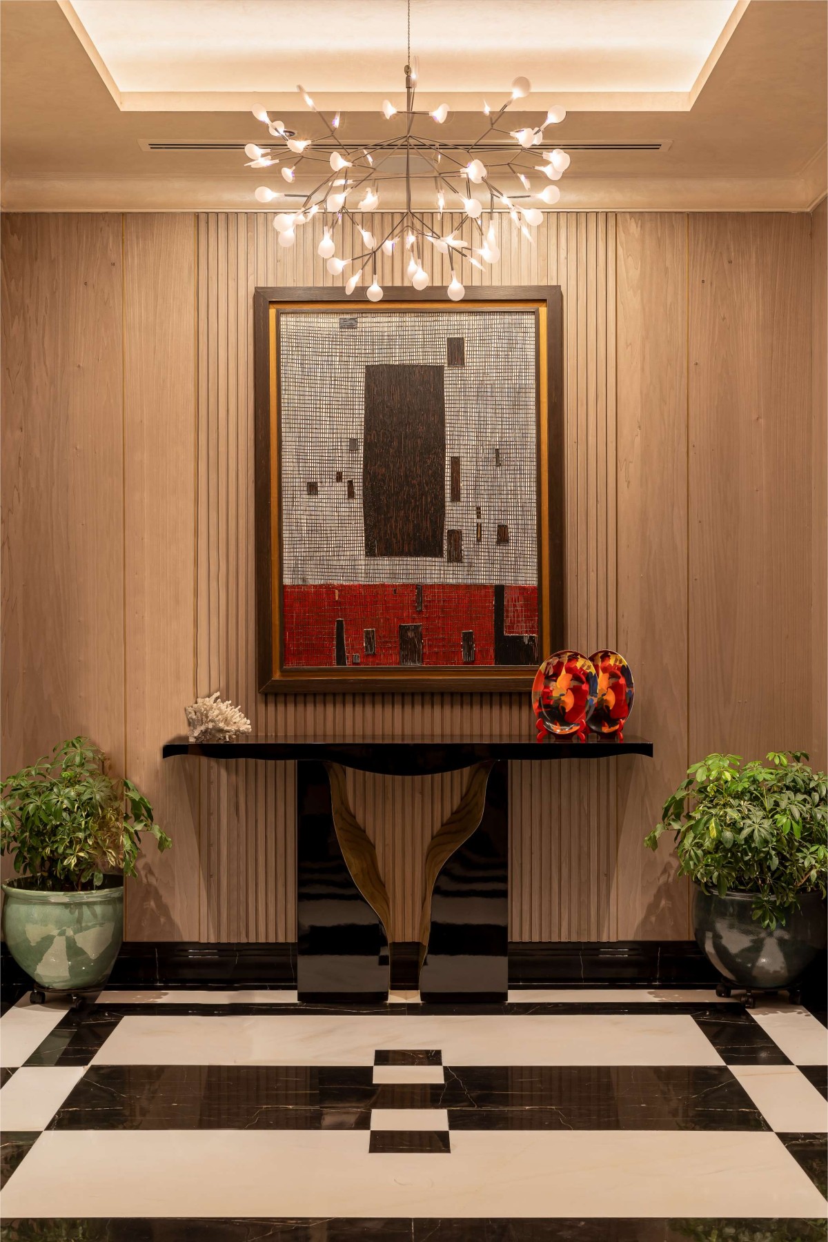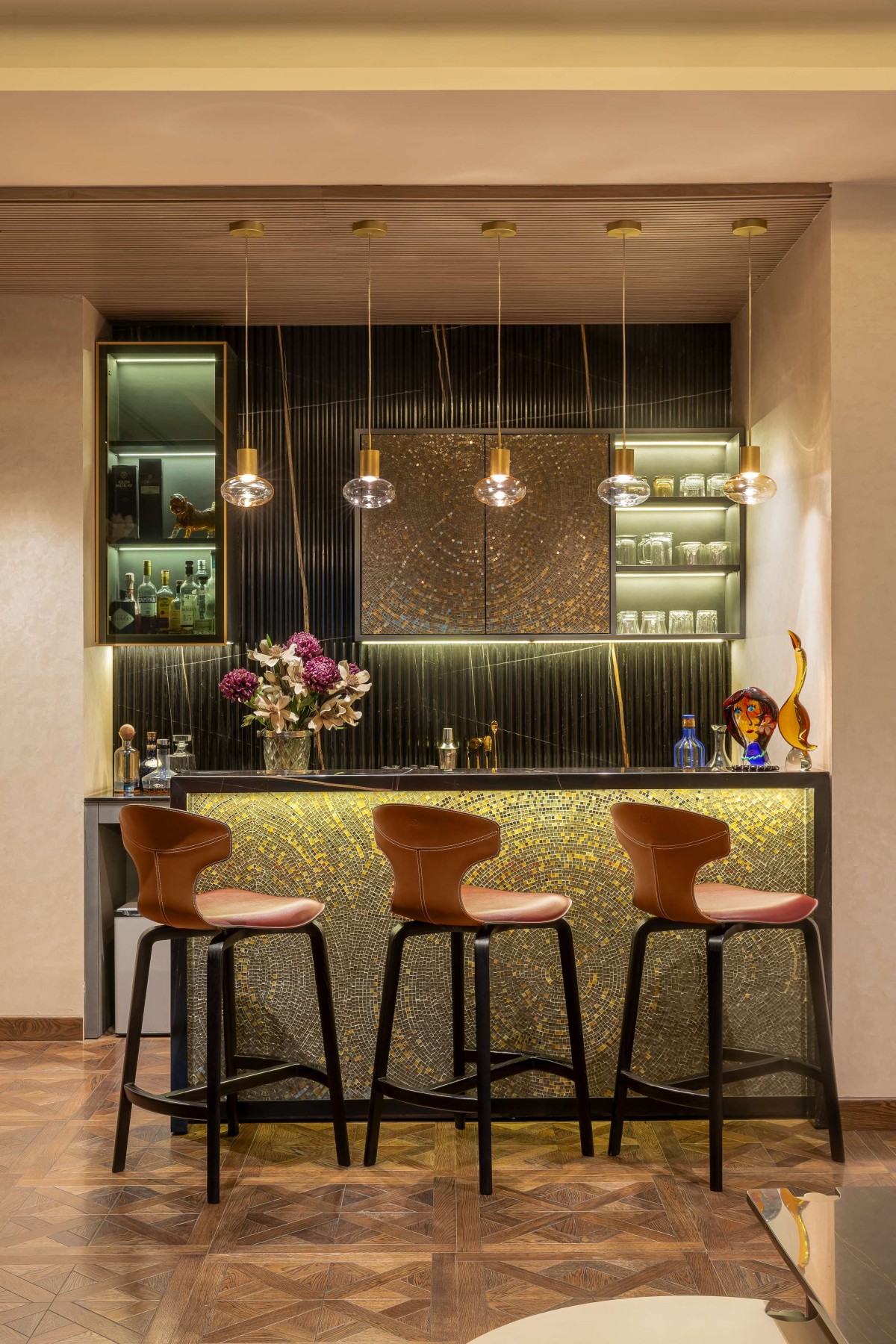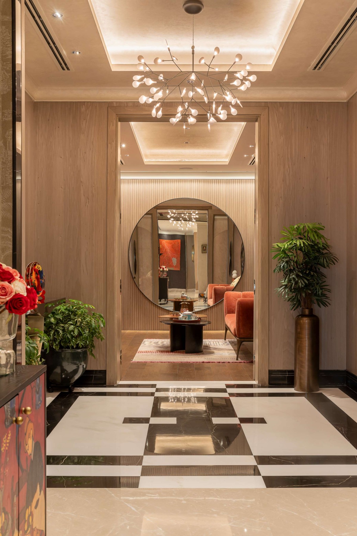 The entrance of the home and the lift lobby, characterized by limited furnishings, served as transition spaces that made a bold impact. With striking flooring and elaborate wall treatments, these areas offered a visual prelude to the grandeur that awaited within. This design journey was a testament to luxury and uncompromising vision. Every aspect, every element, bore the hallmark of thoughtful consideration and precise execution. It was a canvas where aspiration met realization, where lifestyle found its architectural expression!