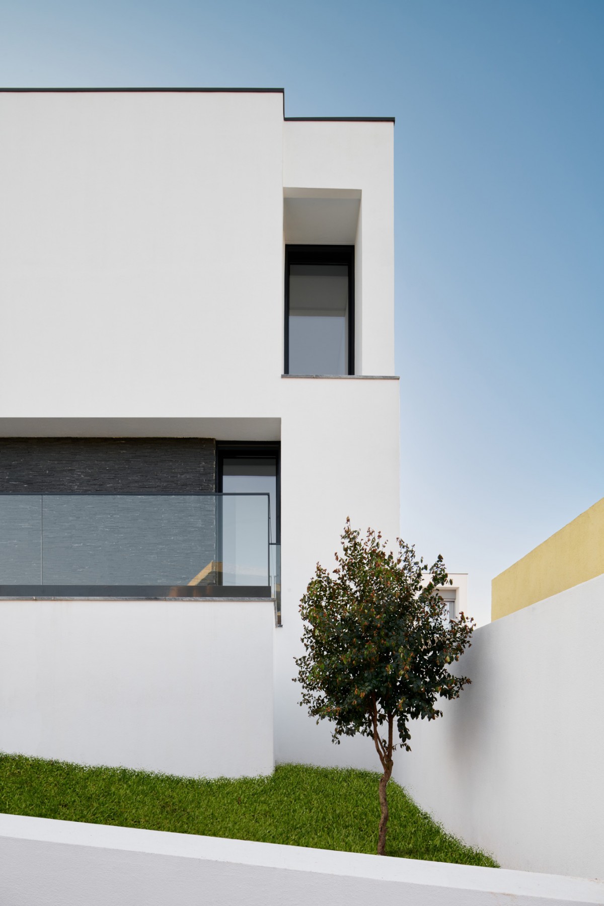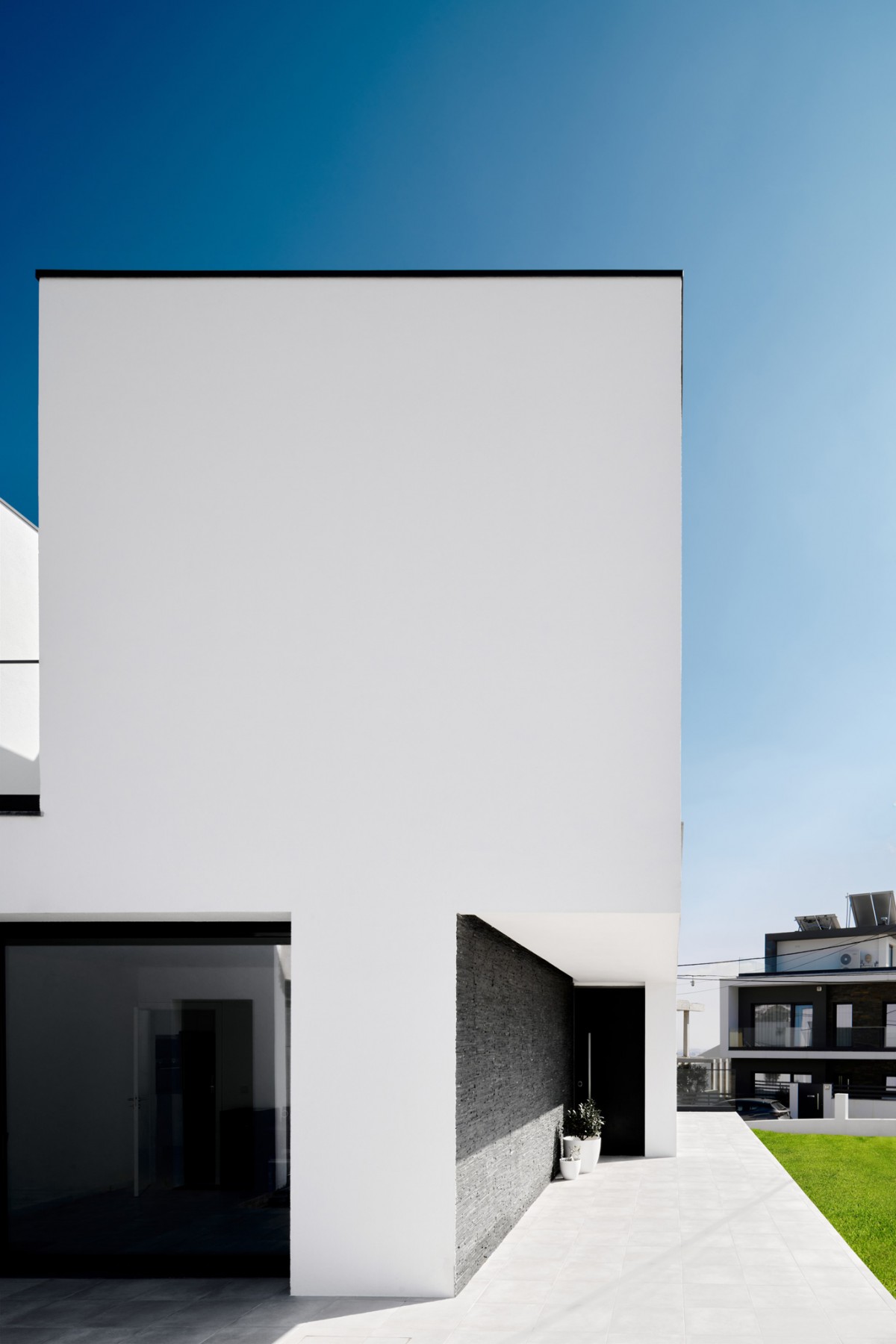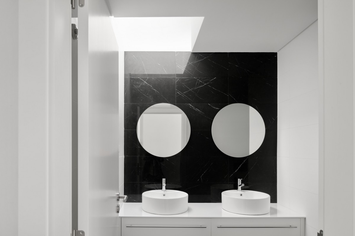 This contemporary 2-storey dwelling is defined by white chromatic planes, that intersect with glass planes, and a strongly defined black stone wall on the lower floor.