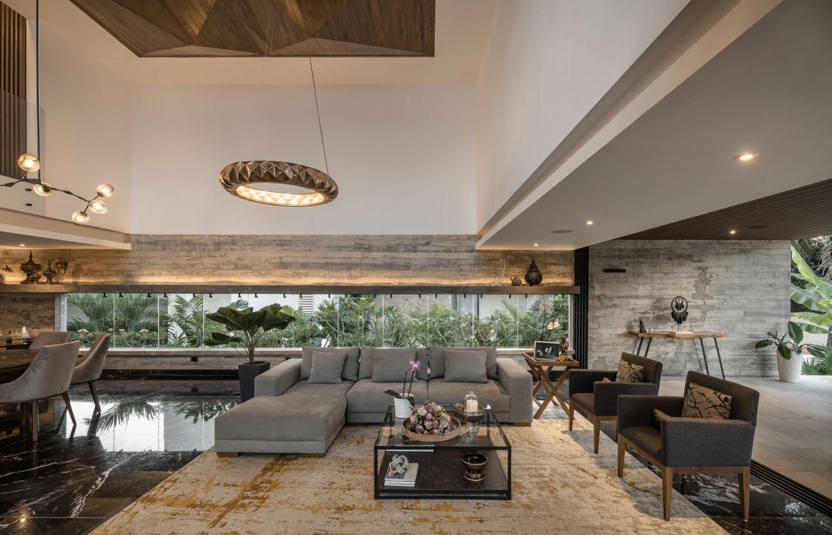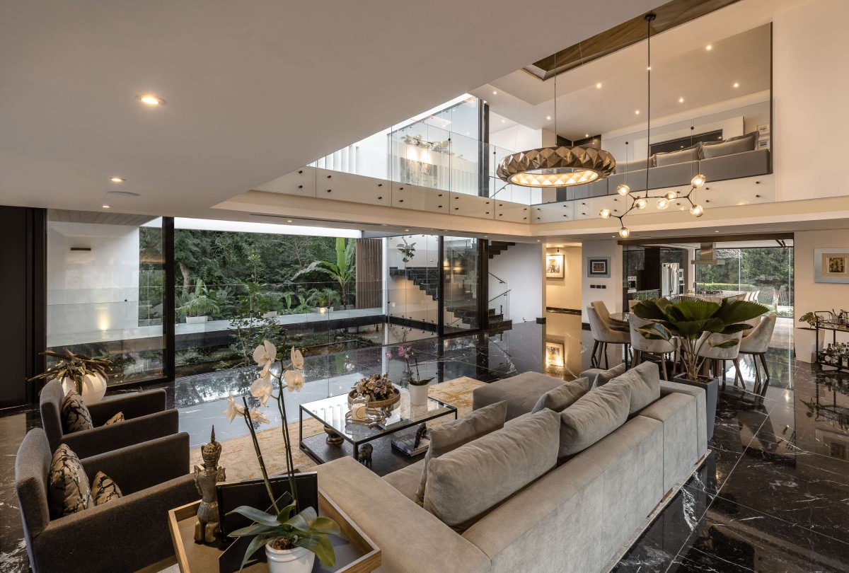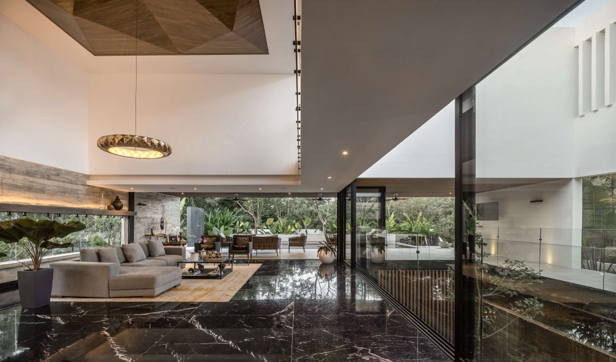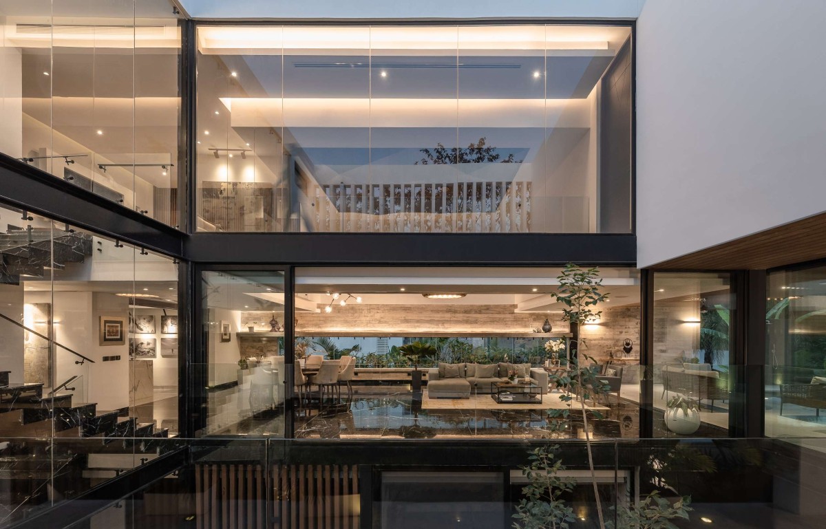 The protagonist of the space is the large courtyard in the center of the house, visible from the underground thanks to a triple height that extends towards the sky. Many of the spaces in the house have views of this patio, giving it a unique and special touch that allows access to both the interior and exterior of the house, so that when walking outside, you are crossing an outdoor bridge. On one side, you will have a garden and on the other, an English courtyard that visually connects with the underground, always surrounded by a green landscape and the sky.