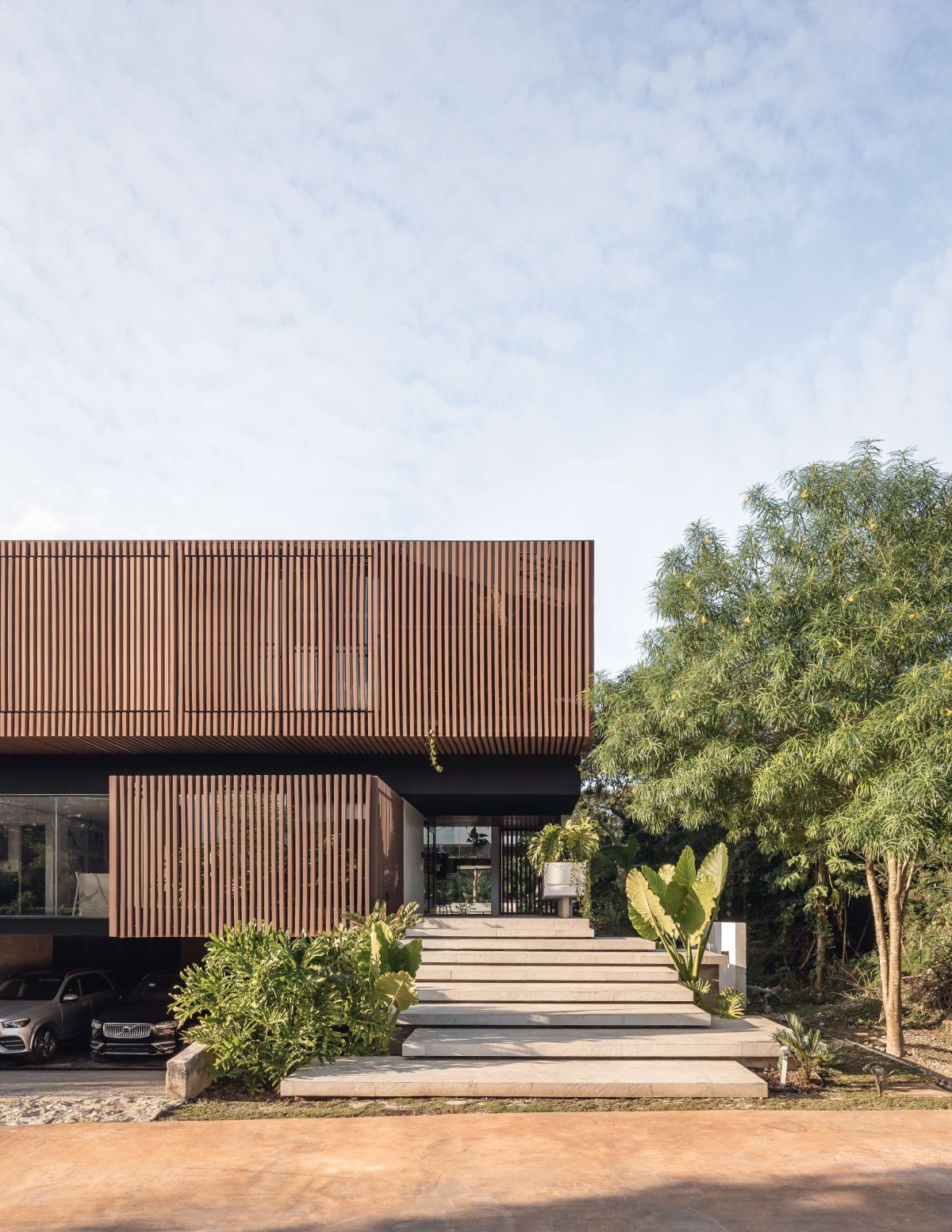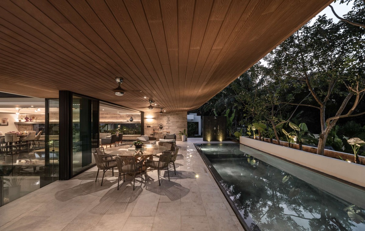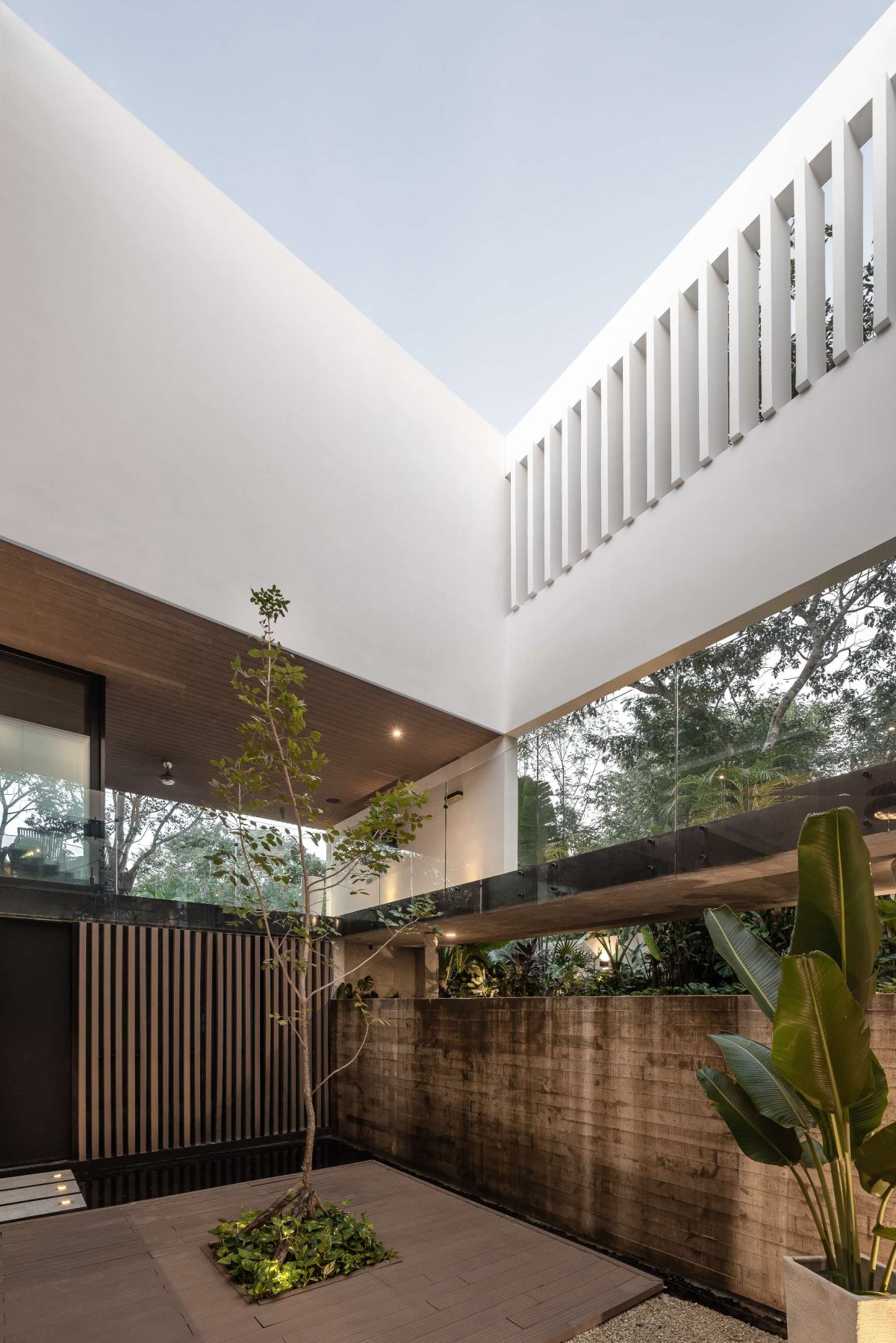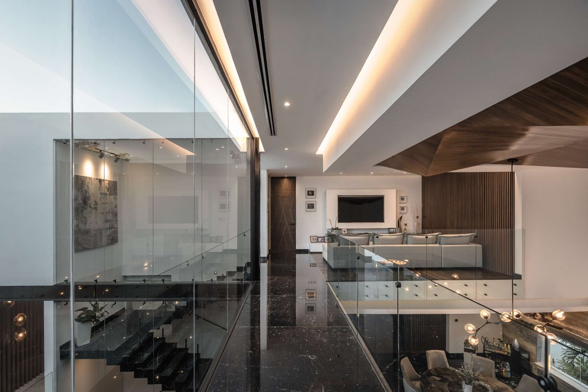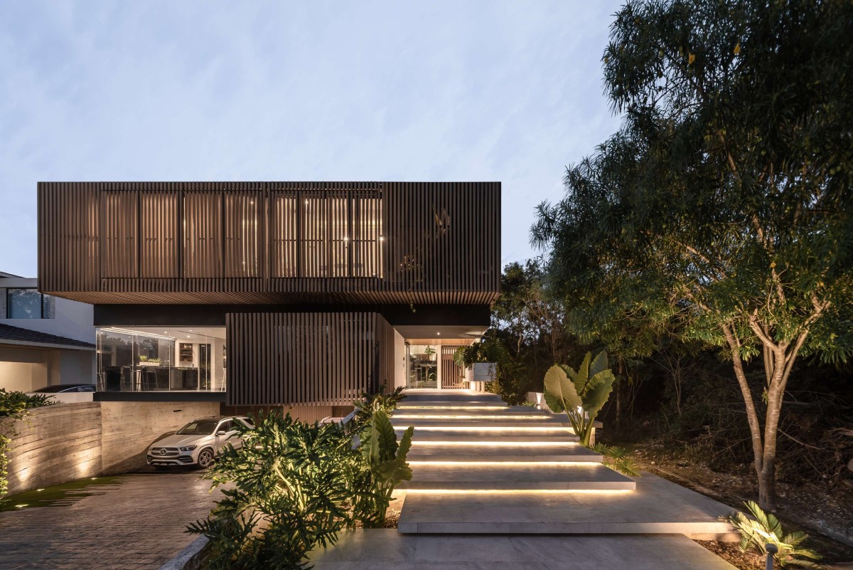On the upper floor, our main idea was to create a space from which you could access the children's rooms with views towards the street and a wooden lattice that opens and closes automatically to ensure necessary privacy. If you want to access the master bedroom, you have to go around and pass through the social area. On the right side, there is a double height downwards that connects to the underground, creating a huge feeling of spaciousness in the space. Upon reaching the master bedroom, the first thing that greets you is a large window that blends with all the vegetation on the north side of the house. The master bathroom, located on the west side of the house, has a bathtub connected to a terrace to enjoy an outdoor bath.