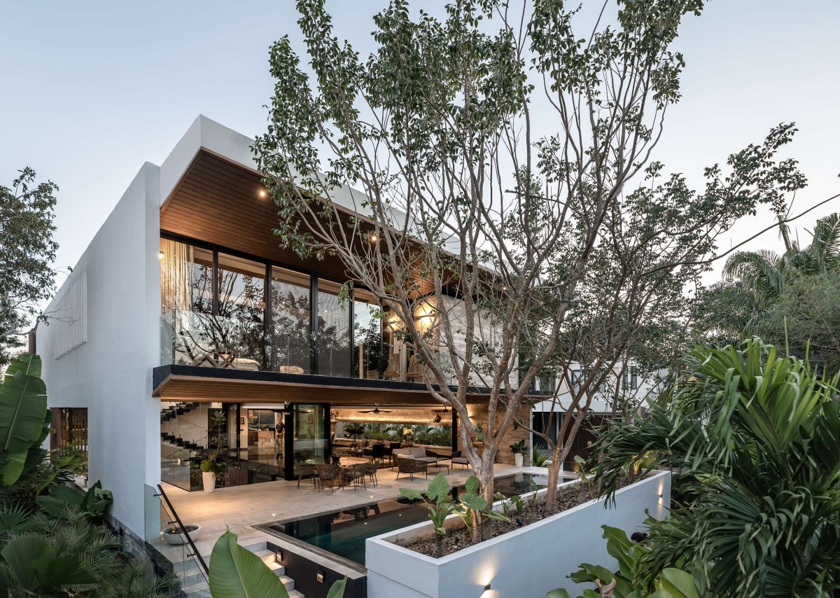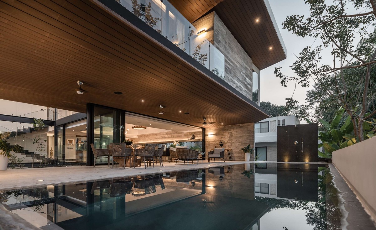 Casa Mulix is an oasis of tranquility and harmony in nature, a place where the connection with the natural environment is palpable in every corner. It envelops you in a feeling of well-being and fulfillment that lasts long after your visit. From the very first moment, the project is impressive, inviting you to discover its secrets as you explore it. The first thing that catches your attention is the large volume that dominates the facade, which seems to float over the first level and has the opportunity to open up to enjoy the views or close to ensure privacy. During the day, this volume becomes a solid block, while at night, with interior lighting, it transforms into a large lamp.