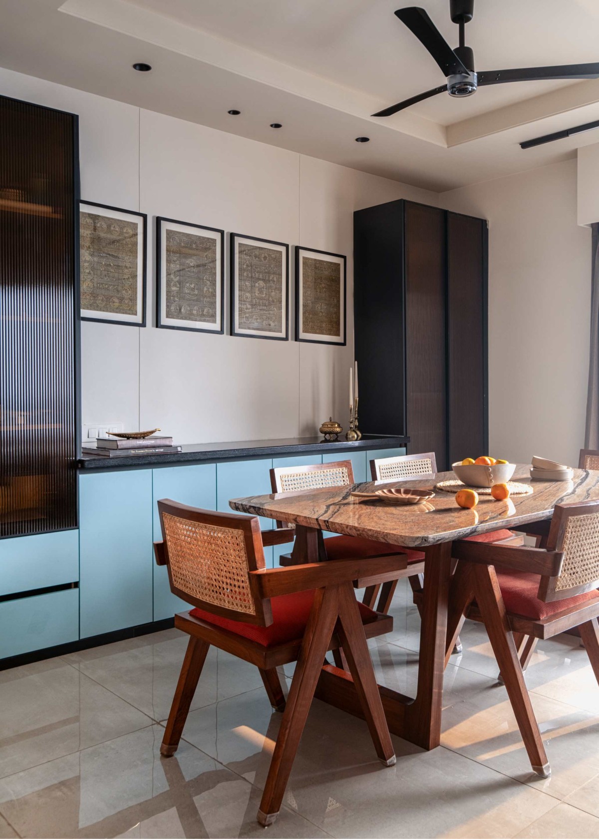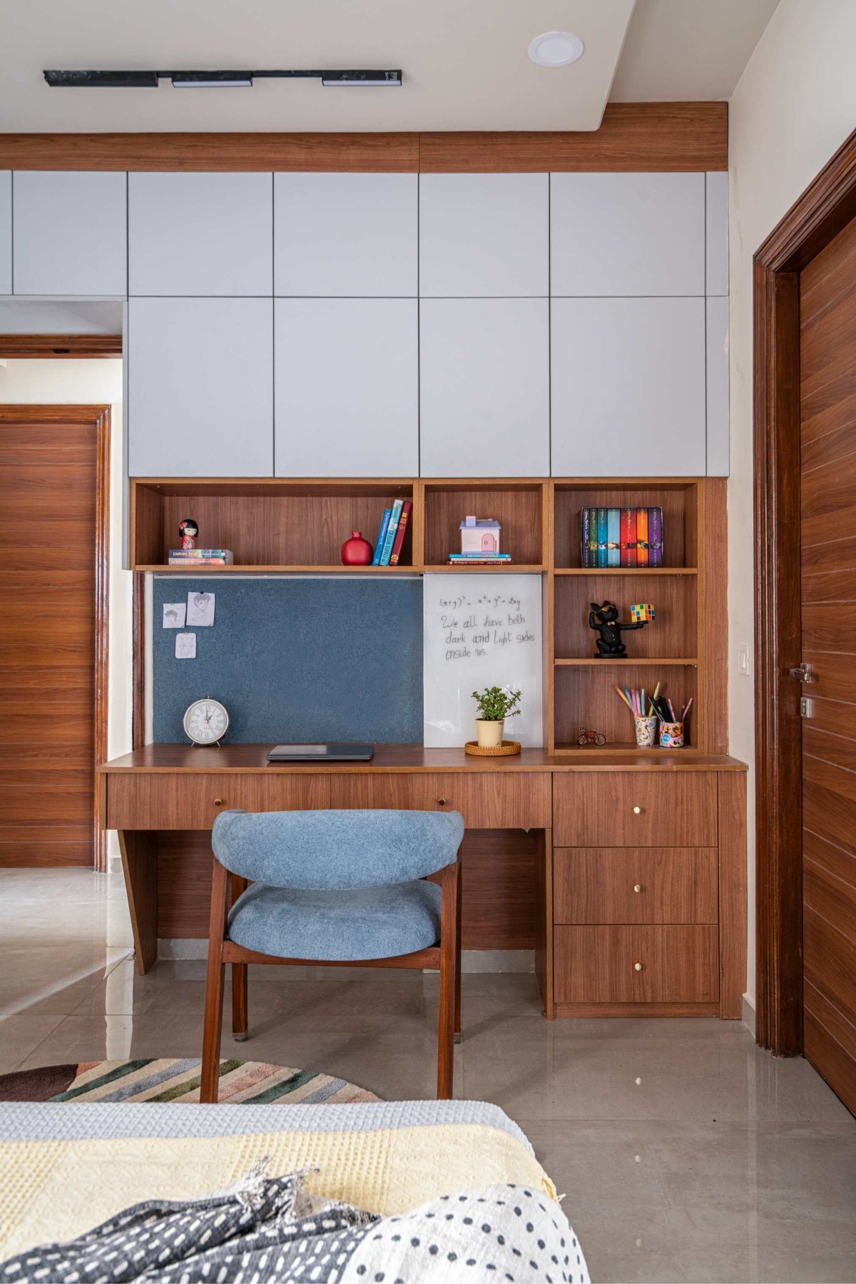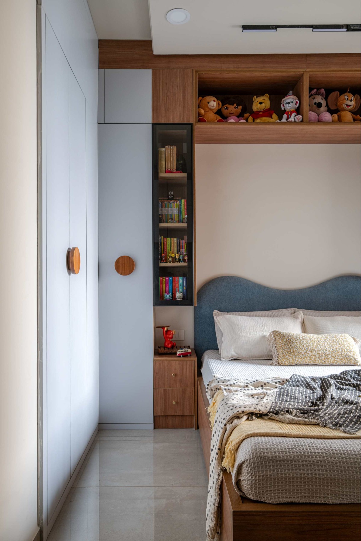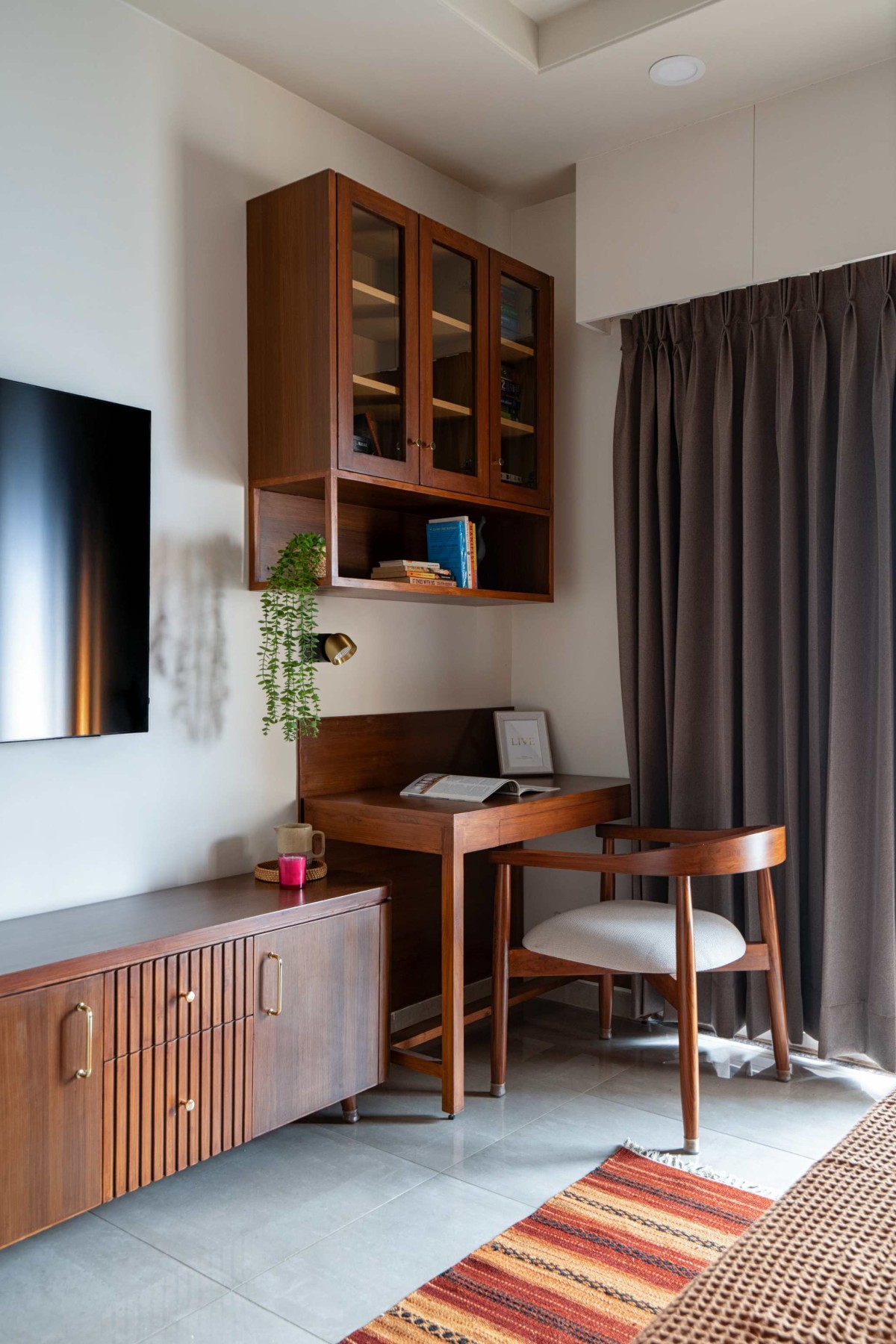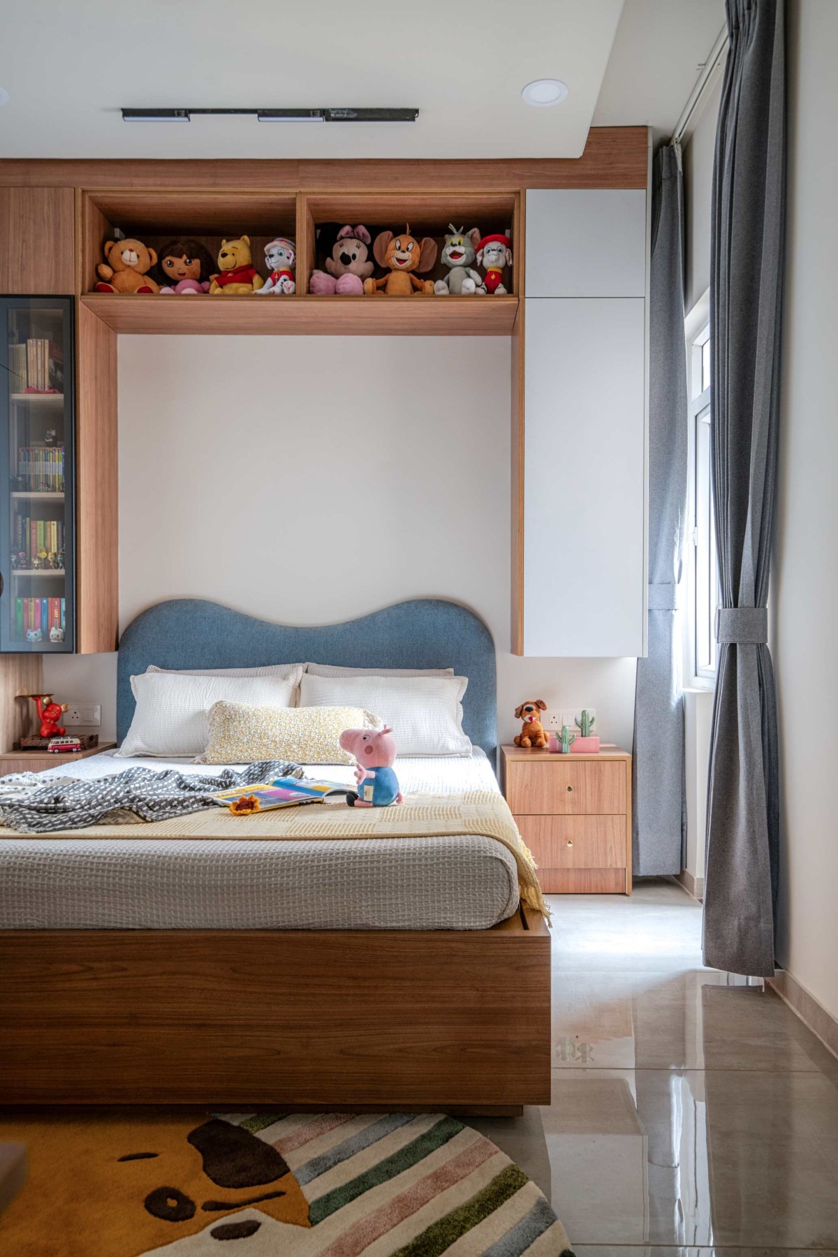 Another bedroom embraces a snug window seat, invitation to slow down with a morning chai or a good book. Storage has been seamlessly integrated around it, blending into the overall design rather than standing apart. Clean-lined wardrobes, warm finishes and concealed functionality ensure the room remains visually light yet highly practical.