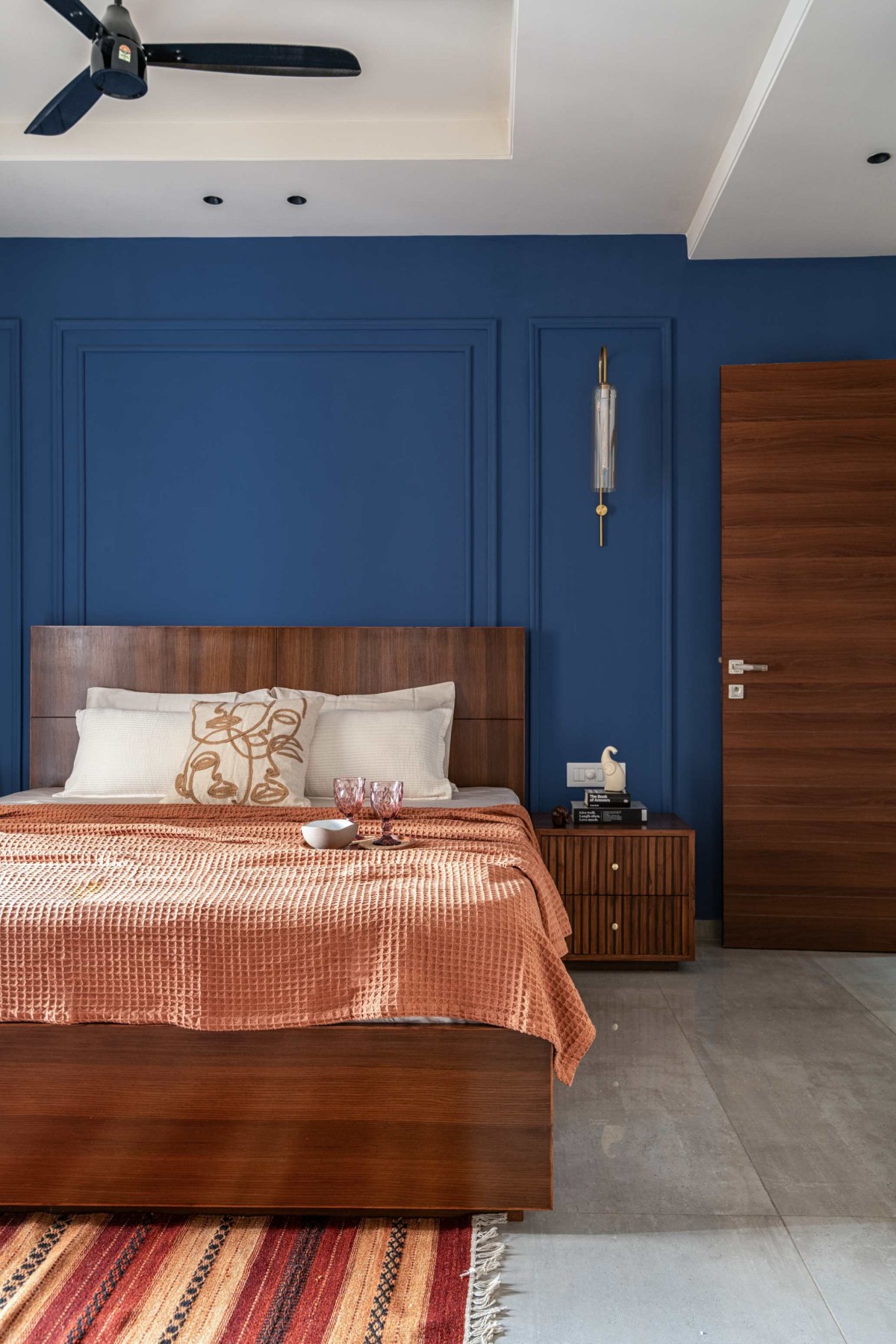 In the bedrooms, the approach remains simple, calm and intentional. A rich blue backdrop with classic design moulding details to lend quiet character. The warmth of wood balances the coolness of blue and soft furnishings in earthy tones add texture and comfort to the room. Integrated bedside units, subtle lighting and uncluttered surfaces make the room feel restful and functional. It reflects our belief that luxury is not about excess, but about proportion, comfort and thoughtful detailing.