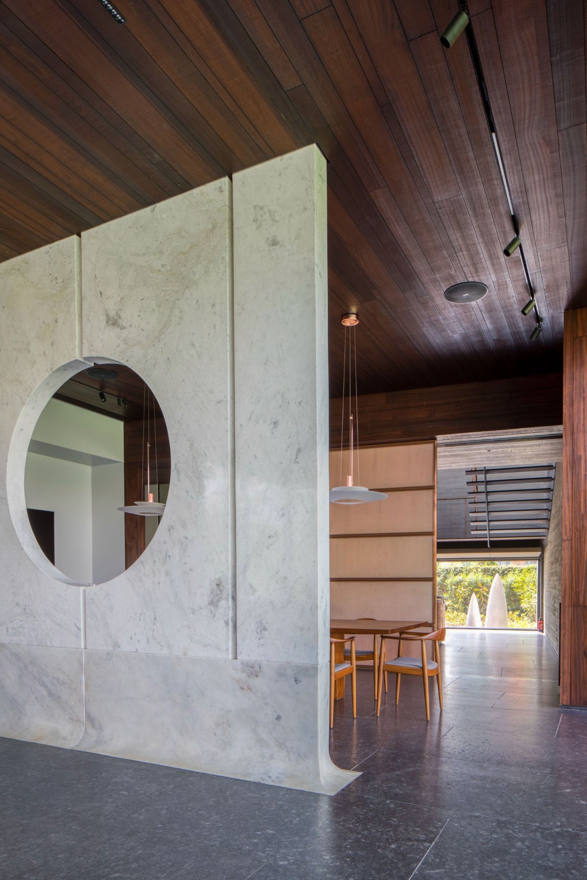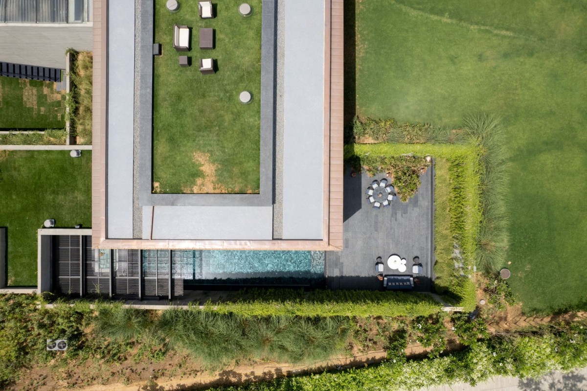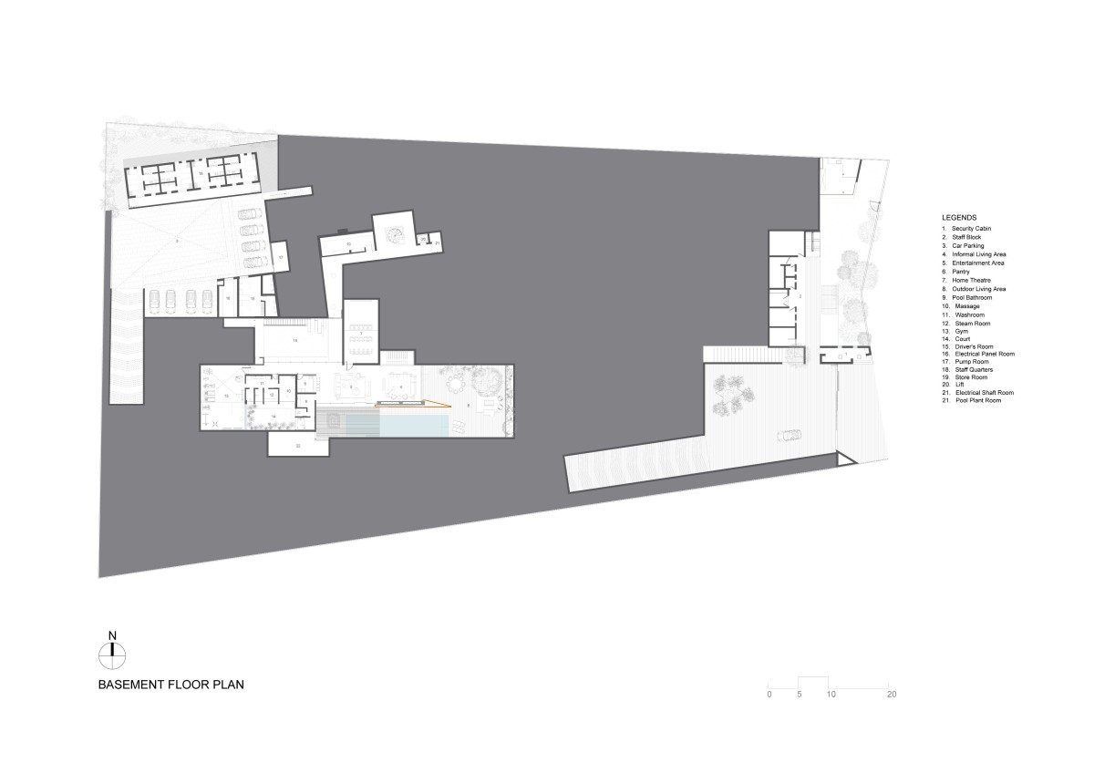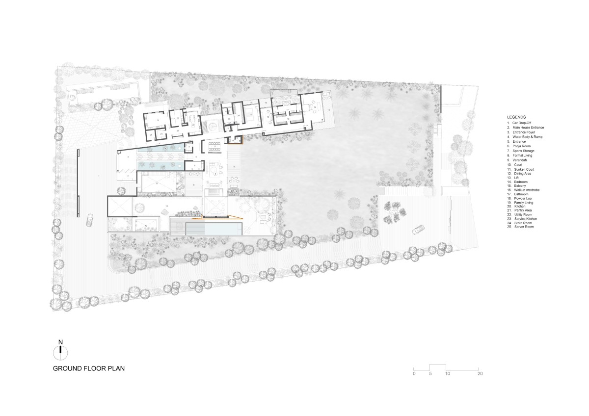 An endearing exploration of spaces below, on and above ground connected by a network of courtyards from intimate to regal, the family has been so forthcoming in realizing a true piece of Architecture. This large multi-generational home occupies a lot of 2.5 acres.