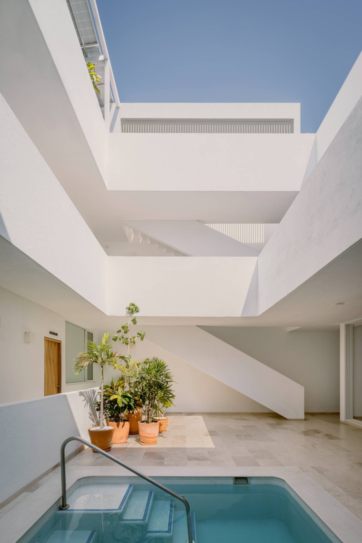 On an irregular terrain measuring 11 meters wide by 26 deep, we developed a small 7-room hotel, thought of as a mix between a house and a hotel, since the owners would live in a separate room from the others during the first years, and if the hotel would do well, they would also choose to rent that room, designed as a suite with independent access, with its own kitchenette, living room and terrace.
