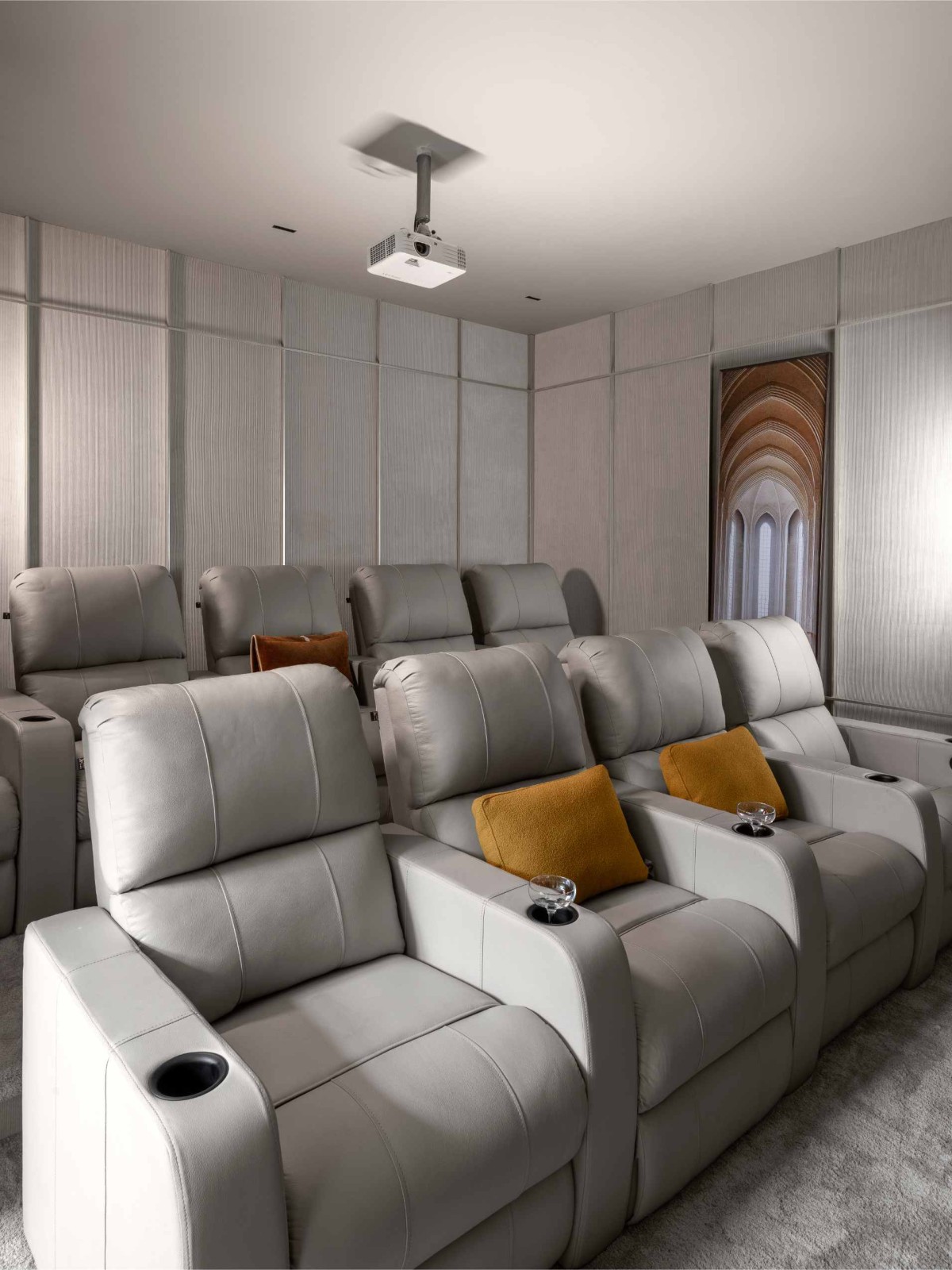 Just like the prayer room, the home theatre too is the ideal escape for those who would like to enjoy their movie nights without stepping out of the home. The light grey leather couches are ergonomically designed for both comfort and style.