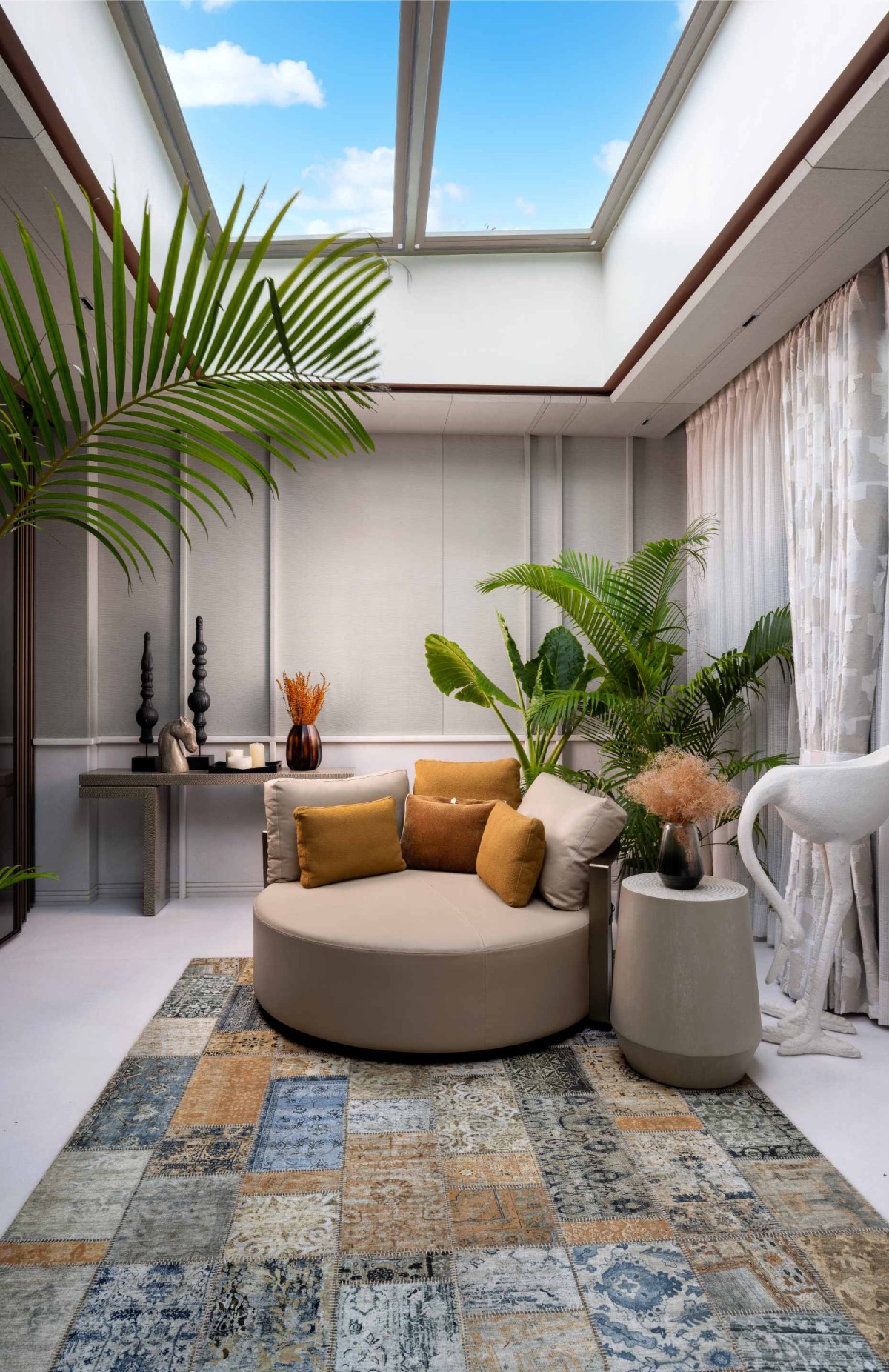 One of the most fascinating areas in this home is the common space with the open-to-sky roof serving as a magnificent canopy, seamlessly merging the interior with the natural world beyond. The vast seating arrangements are strategically placed to encourage social interaction and relaxation, creating a harmonious blend of comfort and aesthetics. This design allows occupants to bask in the beauty of changing skies and natural light, forging a deep connection with the environment. With an emphasis on both functionality and aesthetics, this space redefines the concept of common areas, offering an extraordinary retreat that transcends the confines of traditional indoor spaces and invites a sense of serenity and communion with nature.