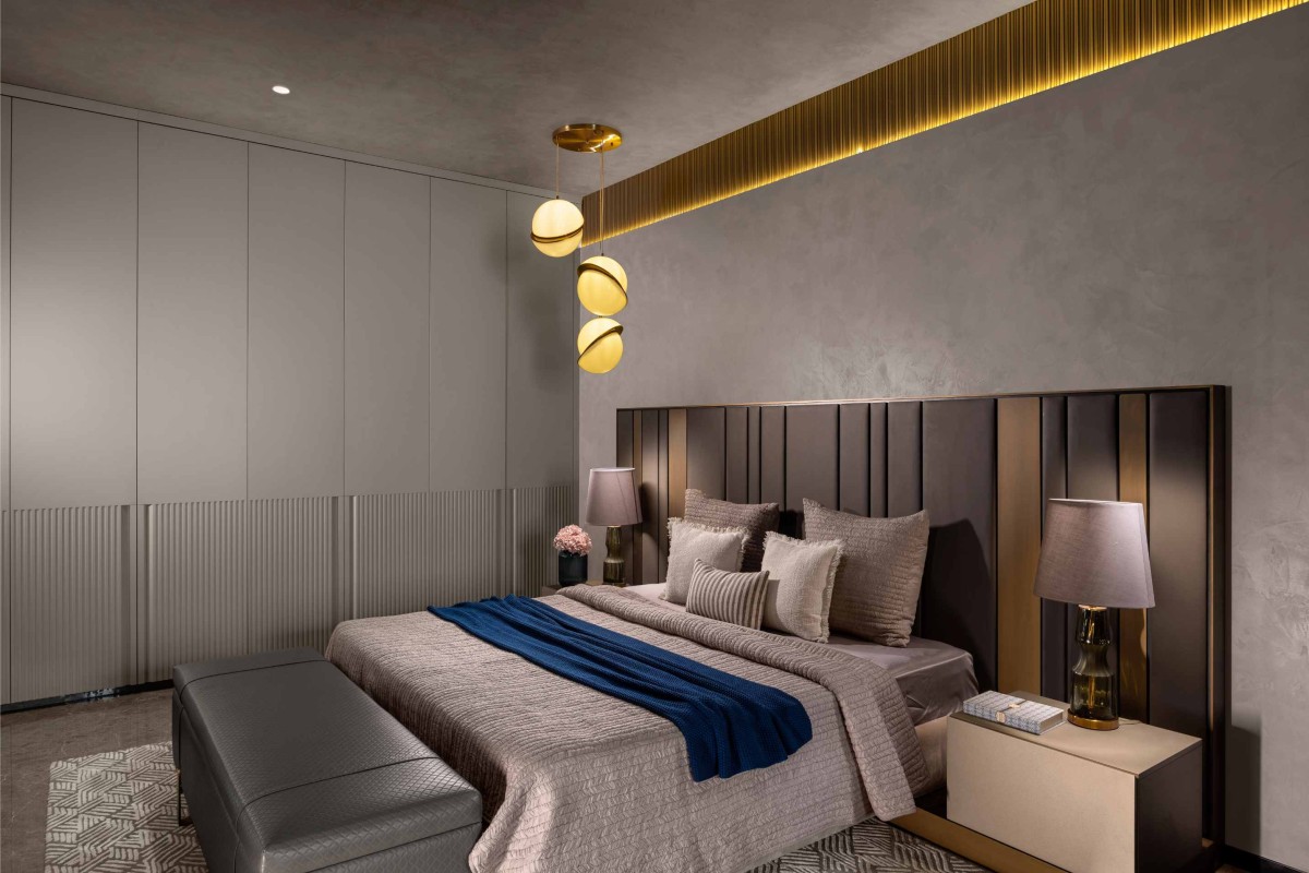 The master bedroom is an essence of contemporary design tastefully embodied in every detail. The seamlessly combined walk-in closet offers both functionality and aesthetics, ensuring that the space is not only a private sanctuary but also a practical storage solution. A padded bed back, upholstered in luxurious fabrics, creates a focal point of comfort and sophistication. Beautifully curated furniture pieces, meticulously selected for their form and function, add an air of refined elegance to the room. Softly falling from above, hanging lights emit a gentle glow, crafting an ideal ambiance for relaxation and intimacy. This master bedroom is a testament to the artful fusion of contemporary design elements, resulting in a haven of style, comfort, and practicality.