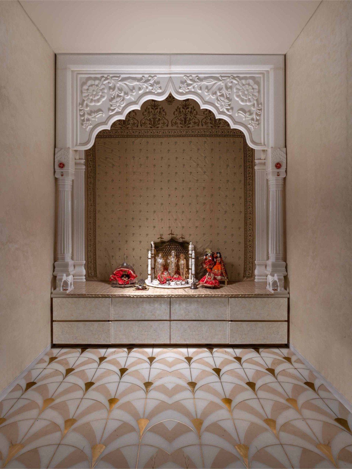 Showcasing the perfect marriage of modernity and traditional aesthetics, the abode is a haven for every generation. The prayer room is all about sophisticated simplicity with a beautiful marble altar placed over a beige and white flooring with golden detailing. The compact room exudes serenity and is the perfect sanctuary for those seeking moments of meditative peace.
