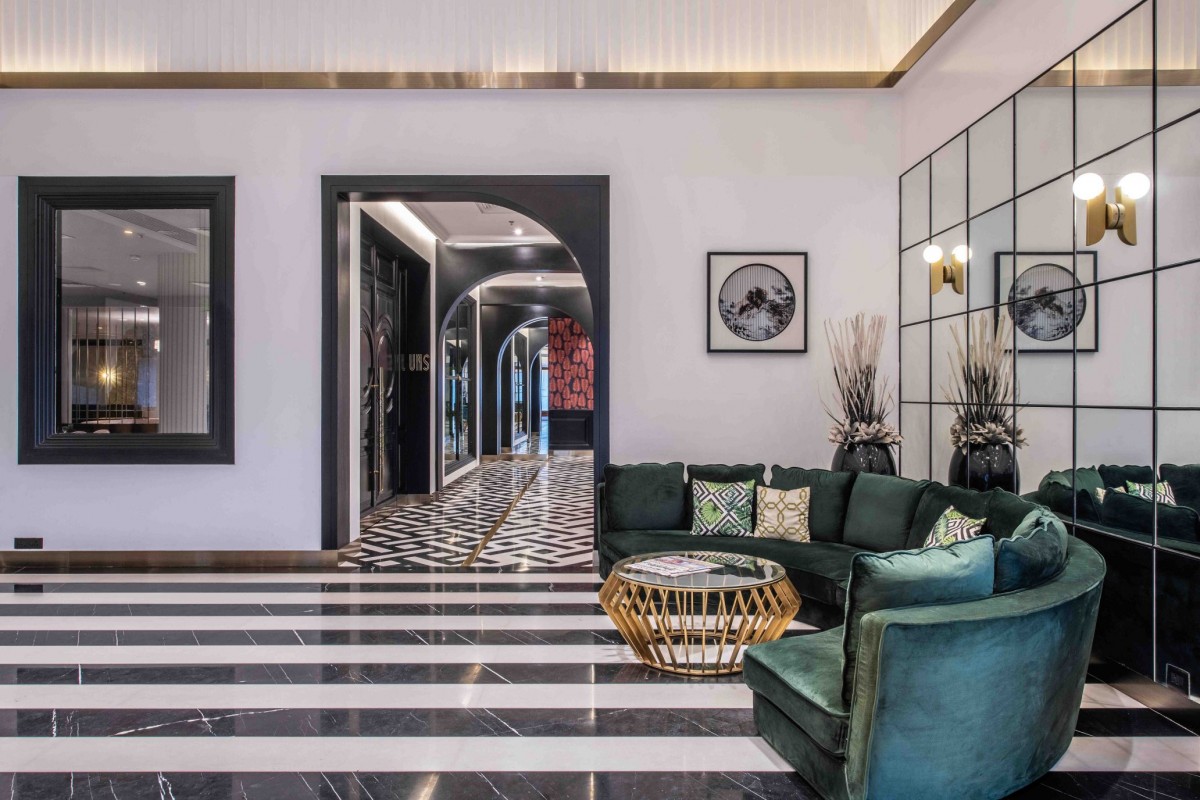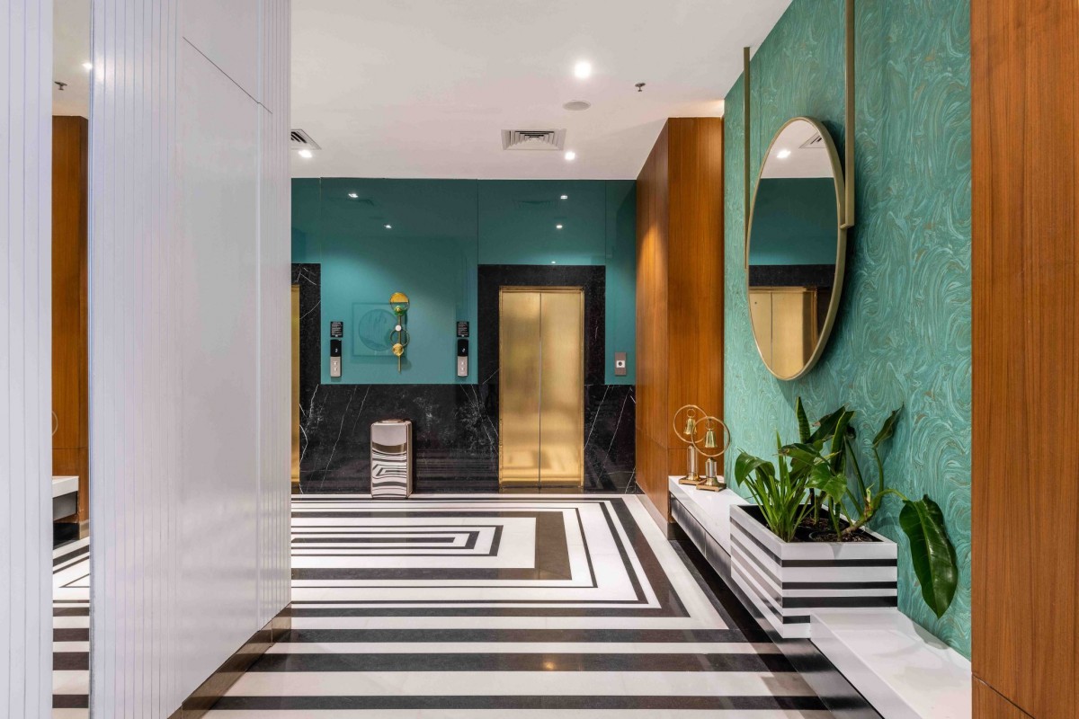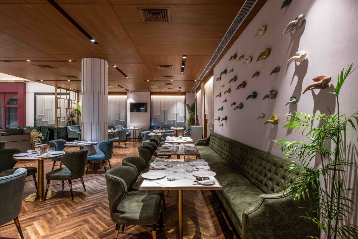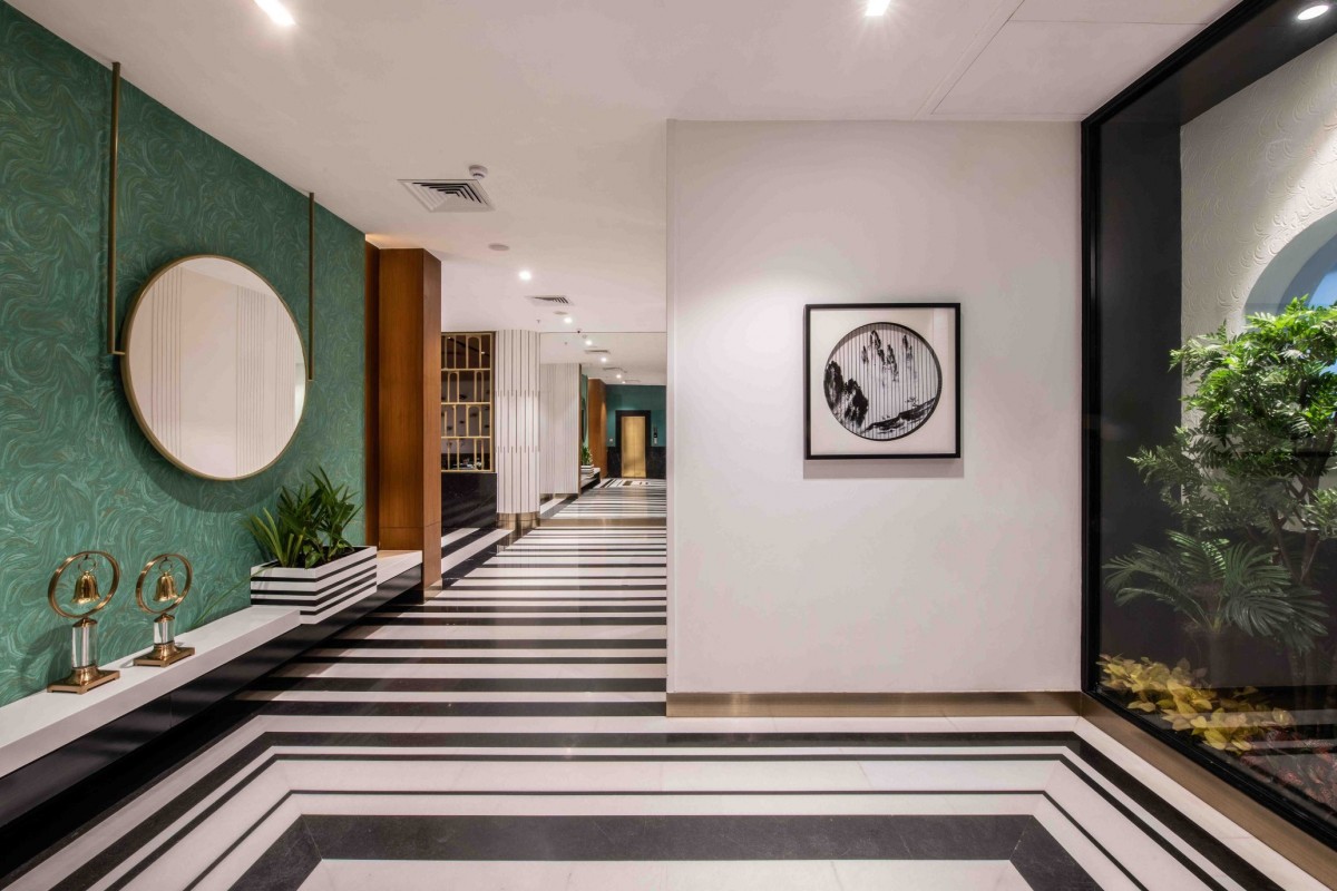 The hotel also comprises of 2 restaurants on the ground floor itself. The black and white flooring continues throughout the floor with a different pattern for each space balanced out with jewel toned furniture, bespoke light fixtures, finishes and spurts of green. The designers have laid out checkerboard flooring in the fine-dine restaurant and contrasted it with pink leather upholstered chairs and sofas having metal legs. A circular private dining area encased in metal bars stands in the center of the restaurant