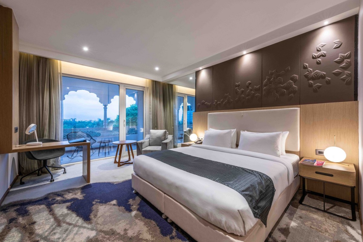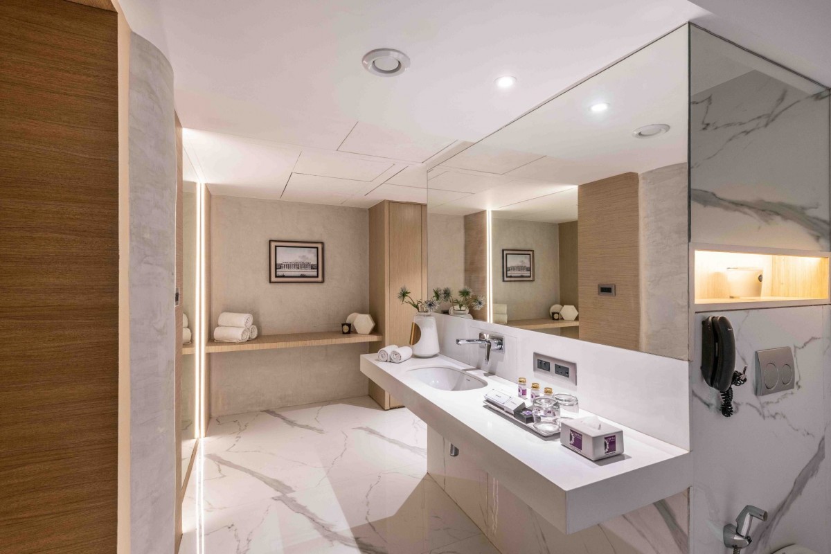 In direct contrast to the very expressive, contemporary lobby and adjoining areas on the ground floor, a more pared-back design approach is taken in the bedrooms at Clarks Inn Suites that exude a warm and comforting vibe. A harmonious color palette through shades of grey along with elegant furniture and no over-the-top trimmings make these rooms a perfect example of understated luxury. The bathrooms too have been done up in white with a similar ethos.
